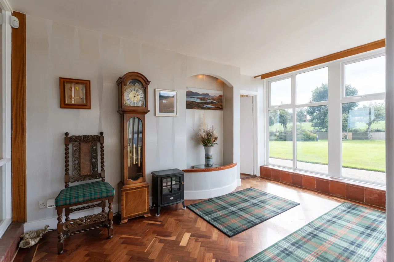 Solid herringbone wood floor, outlook to garden, under display lighting, gas fire