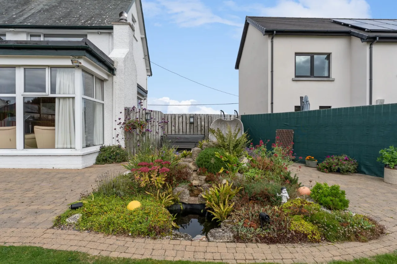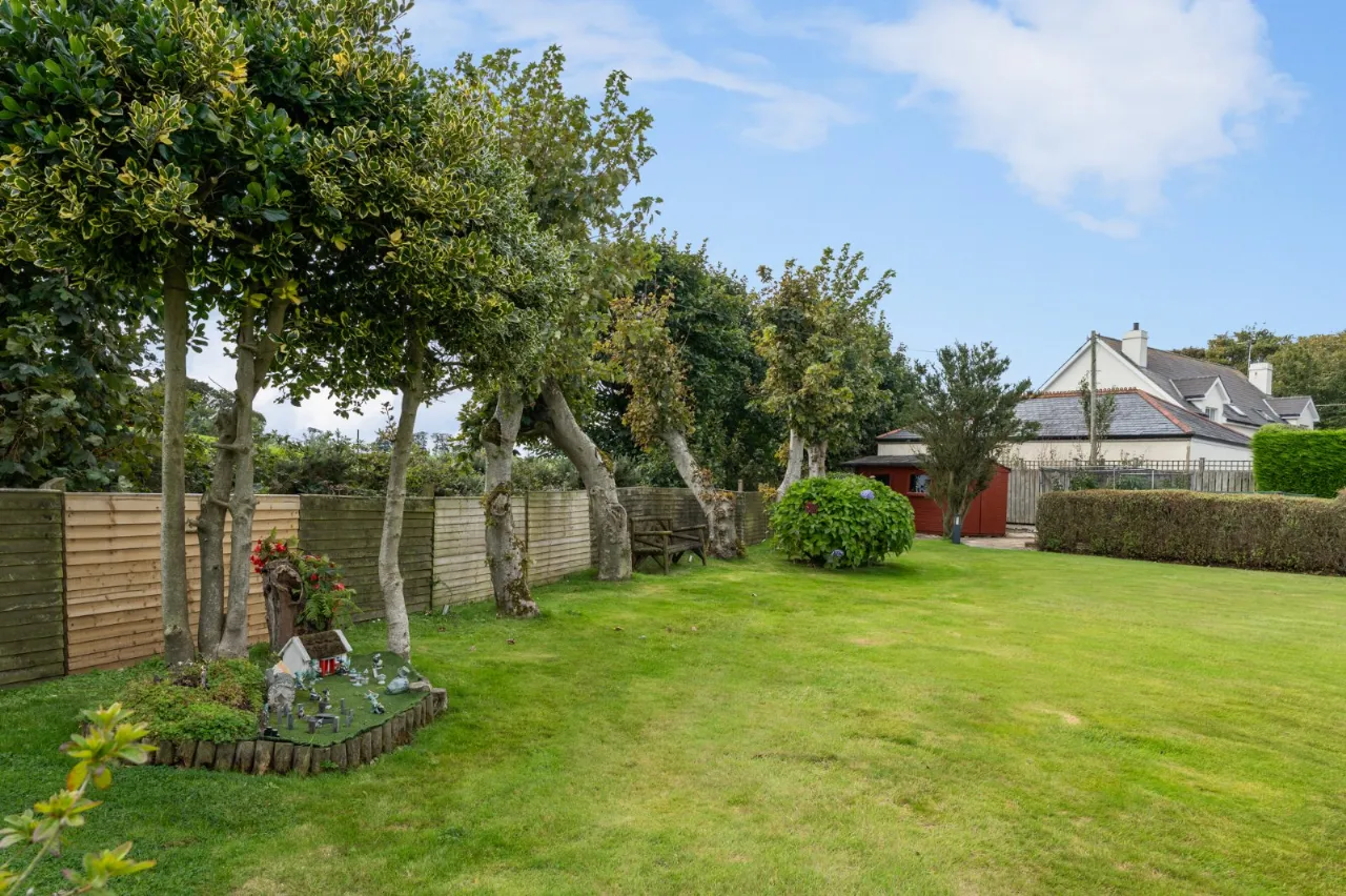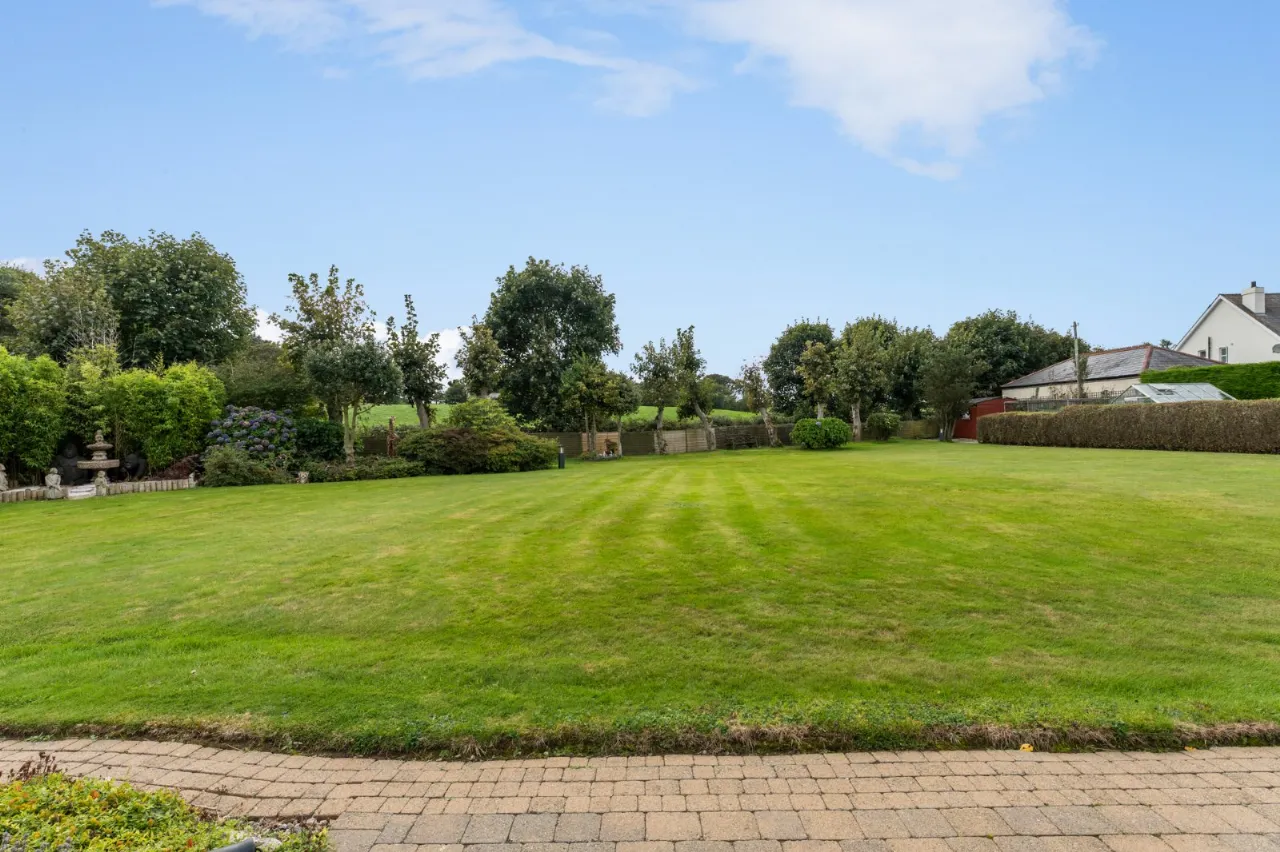 Well tended gardens laid in lawns with flowerbeds in mature plants and shrubs. Water feature. Green house and shed. Outlook to countryside.