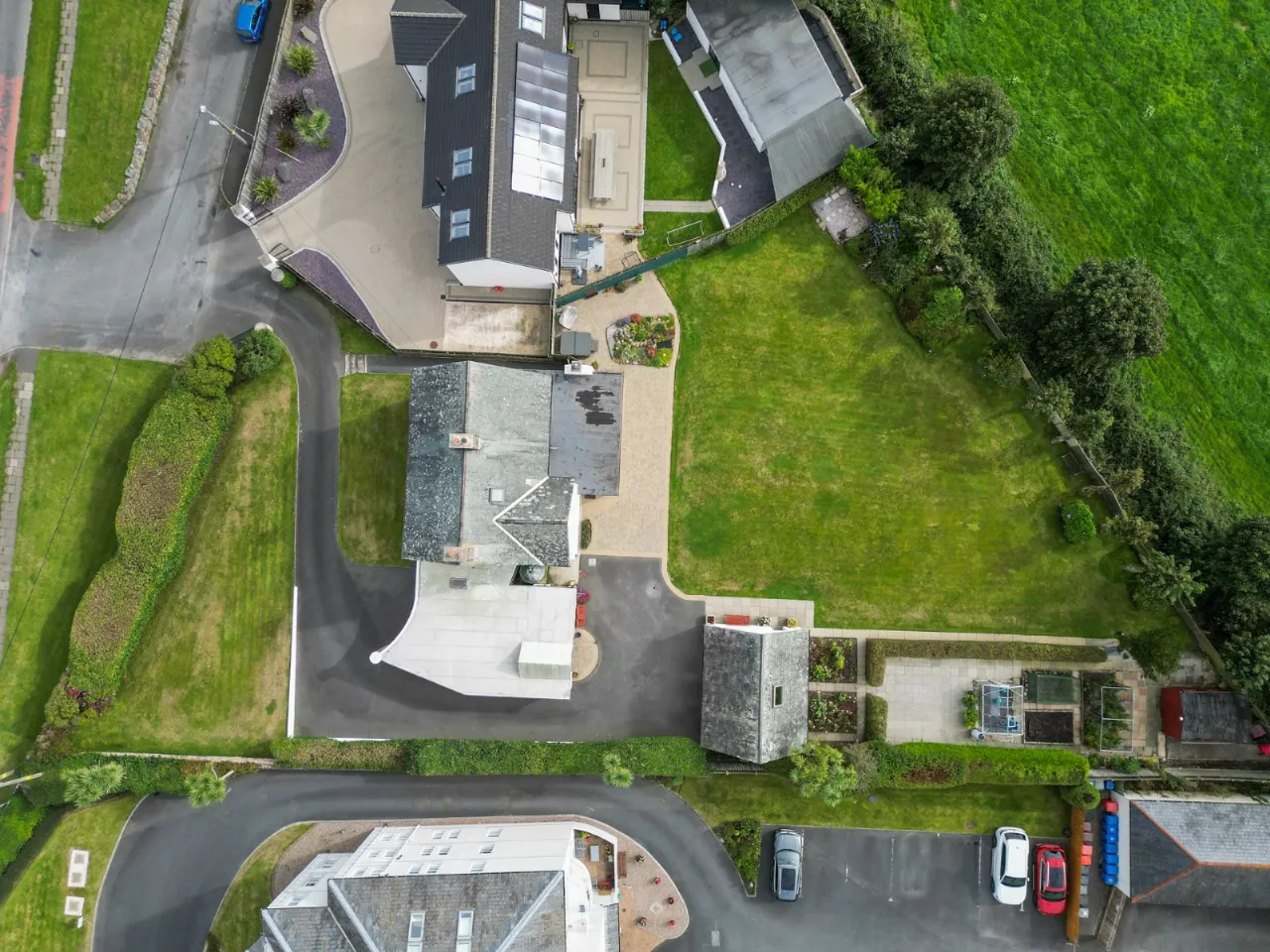 Sweeping tarmac driveway leading to detached double garage. EV charger. Generous outside lighting.