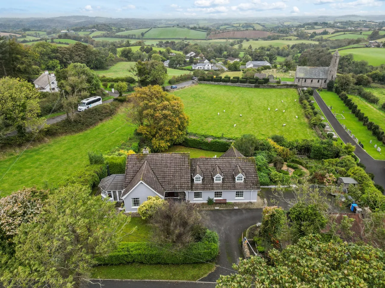 A mature site with private gardens set on a corner site, with views towards Strangford Lough, Co Down and Saul Church. Tarmac driveway, outside lighting landscaped gardens, outbuildings and garage. Rear mature gardens with patio area and mature trees