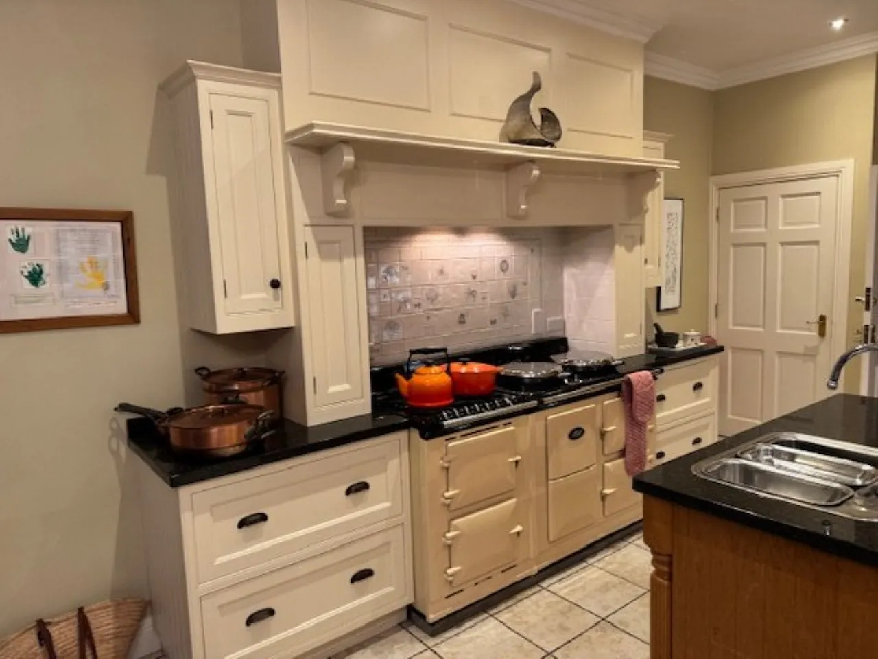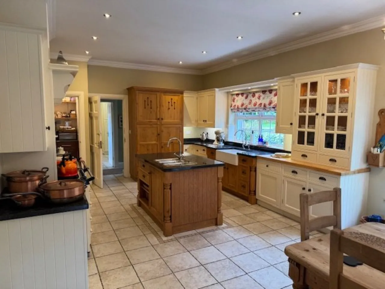 Kitchen – Excellent Range of High and Low Level units, double Belfast sink, Aga Range with 4 ring gas module, Central Island unit, granite worktops, additional sink, integrated 'Miele' dishwasher and fridge. Walk in pantry