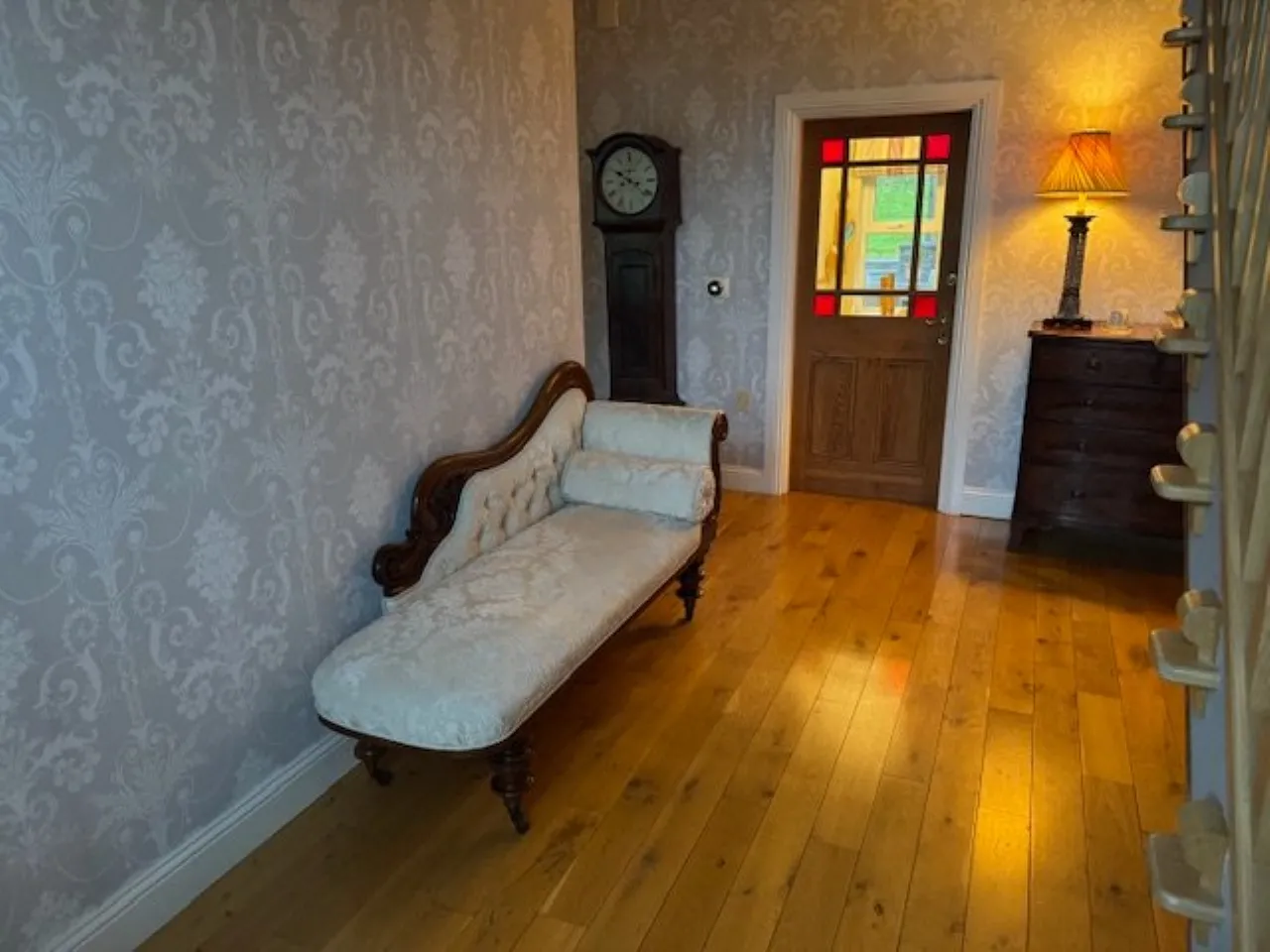 Attractive Hardwood Front Door to entrance hall with Premium French oak flooring. Cornice ceiling