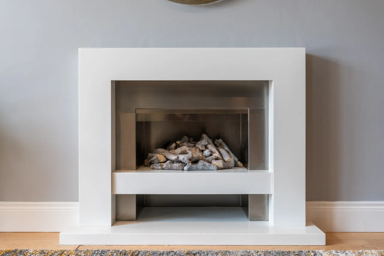 Laminate wood effect flooring, spotlighting, outlook to front, feature gas fireplace