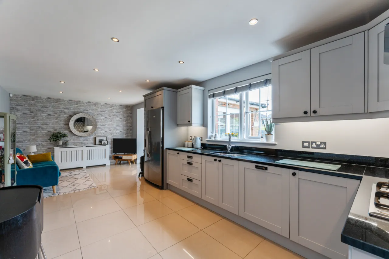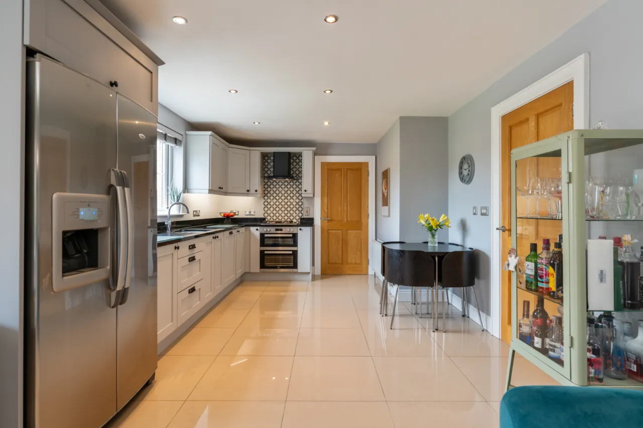 Fantastic range of high and low level units, granite worktops, inset sink with 1.5 tub and mixer tap, integrated double oven with 4 ring gas hob, extractor fan, tiled splashback, plumbed for American style double fridge freezer, integrated dishwasher, tiled flooring throughout, spotlighting, open to dining area