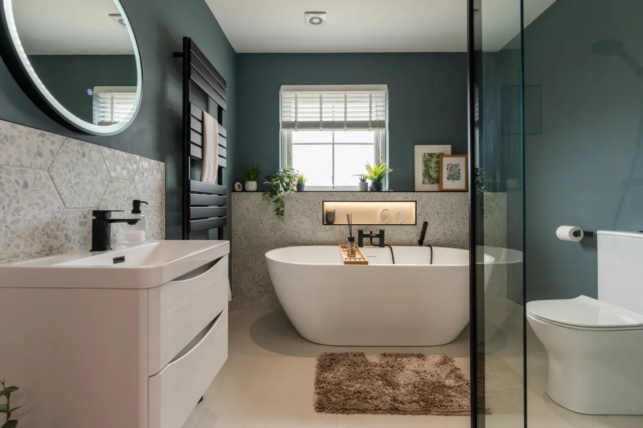 Low flush WC, vanity unit with wash hand basin and mixer tap, stand alone bath with hot and cold tap and handset, walk in thermostatically controlled shower with rainfall shower head and handset, partly tiled walls, tiled flooring, recessed spotlighting, extractor fan, vertical chrome heated towel rail