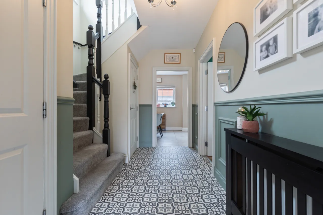 Vinyl flooring, storage below stairs. access to downstairs WC.