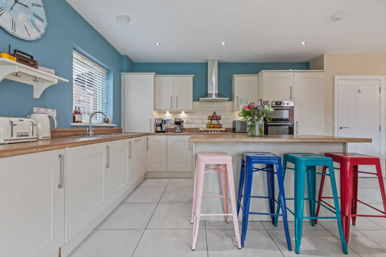 Range of high and low level units with laminate work surface and stainless steel sink unit and drainer, 1.5 tub with mixer tap, integrated fridge freezer, integrated double oven, four ring gas hob with stainless steel extractor fan above, integrated dishwasher, integrated washing machine, island unit for casual dining, partly tiled walls, tiled flooring, recessed spotlighting, open to dining and sun room, cast iron gas stove, double uPVC door leading to rear garden.