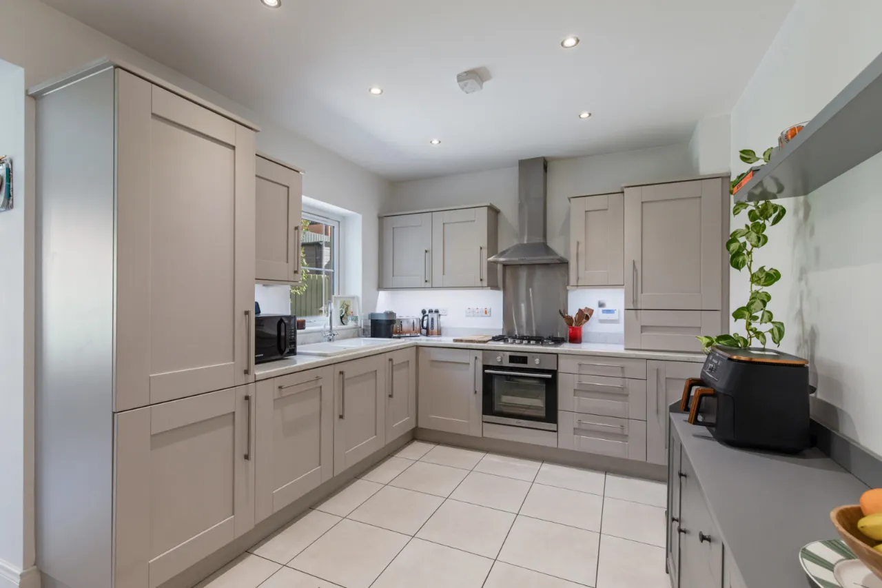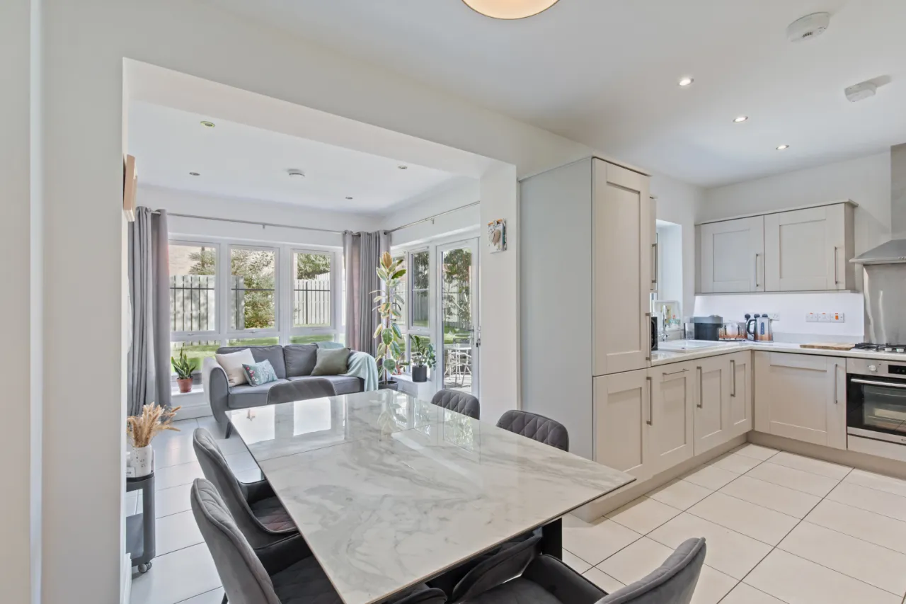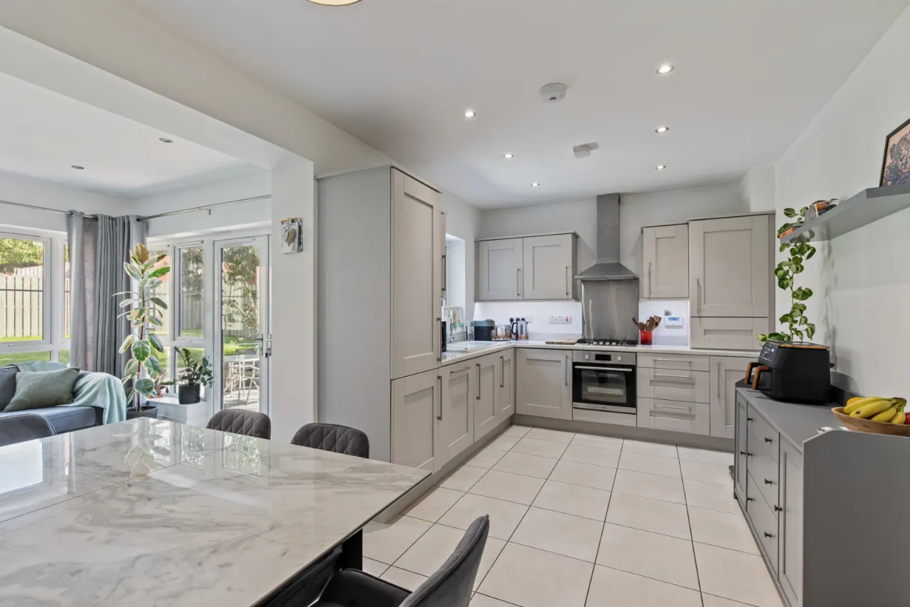 Fantastic range of high and low level units, laminate work surfaces, ceramic sink unit with hot and cold tap, integrated oven, four ring electric hob, stainless steel kitchen splash back, stainless steel extractor fan, integrated fridge freezer, integrated dishwasher, integrated washing machine, gas fired central heating boiler, recessed spotlighting, tiled flooring, open to dining area with access through to sunroom.
