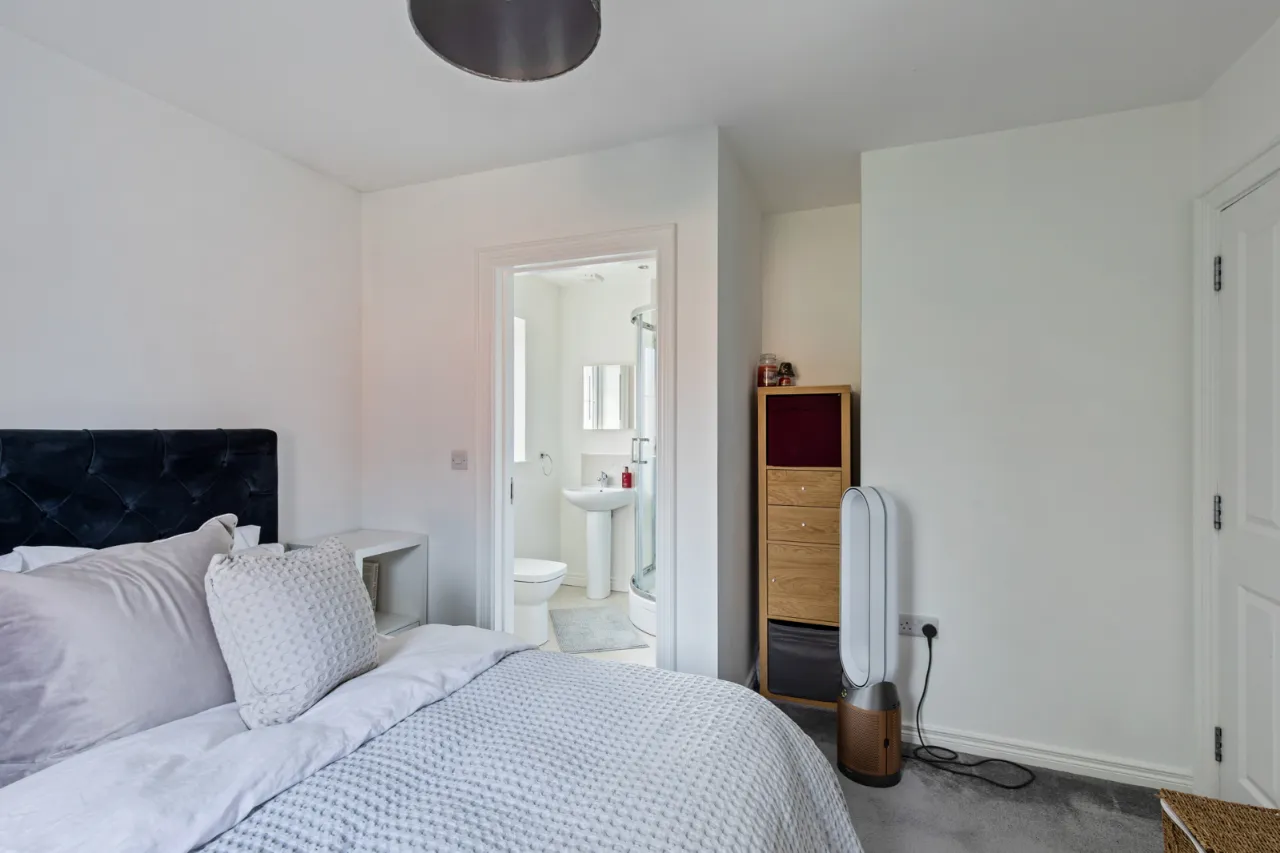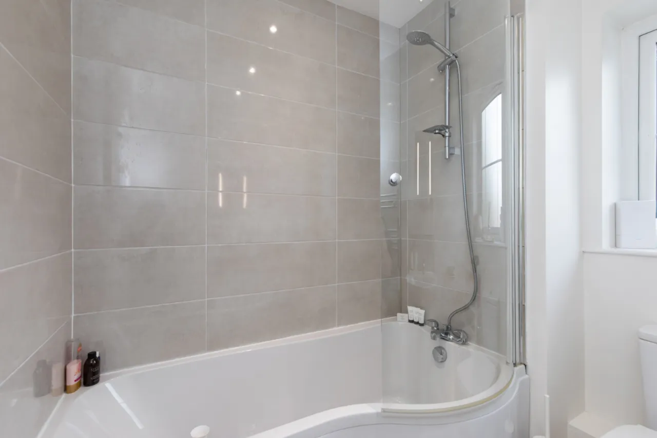 White suite comprising of low flush WC, pedestal wash hand basin with mixer tap, tiled splash back, walk-in thermostatically controlled shower with rainfall shower head and handset, partly tiled walls, tiled flooring, recessed spotlighting, extractor fan, vertical chrome heated towel rail.