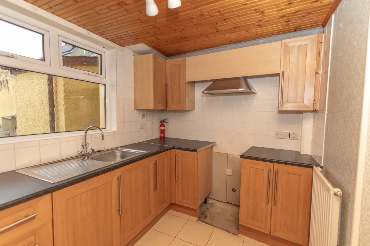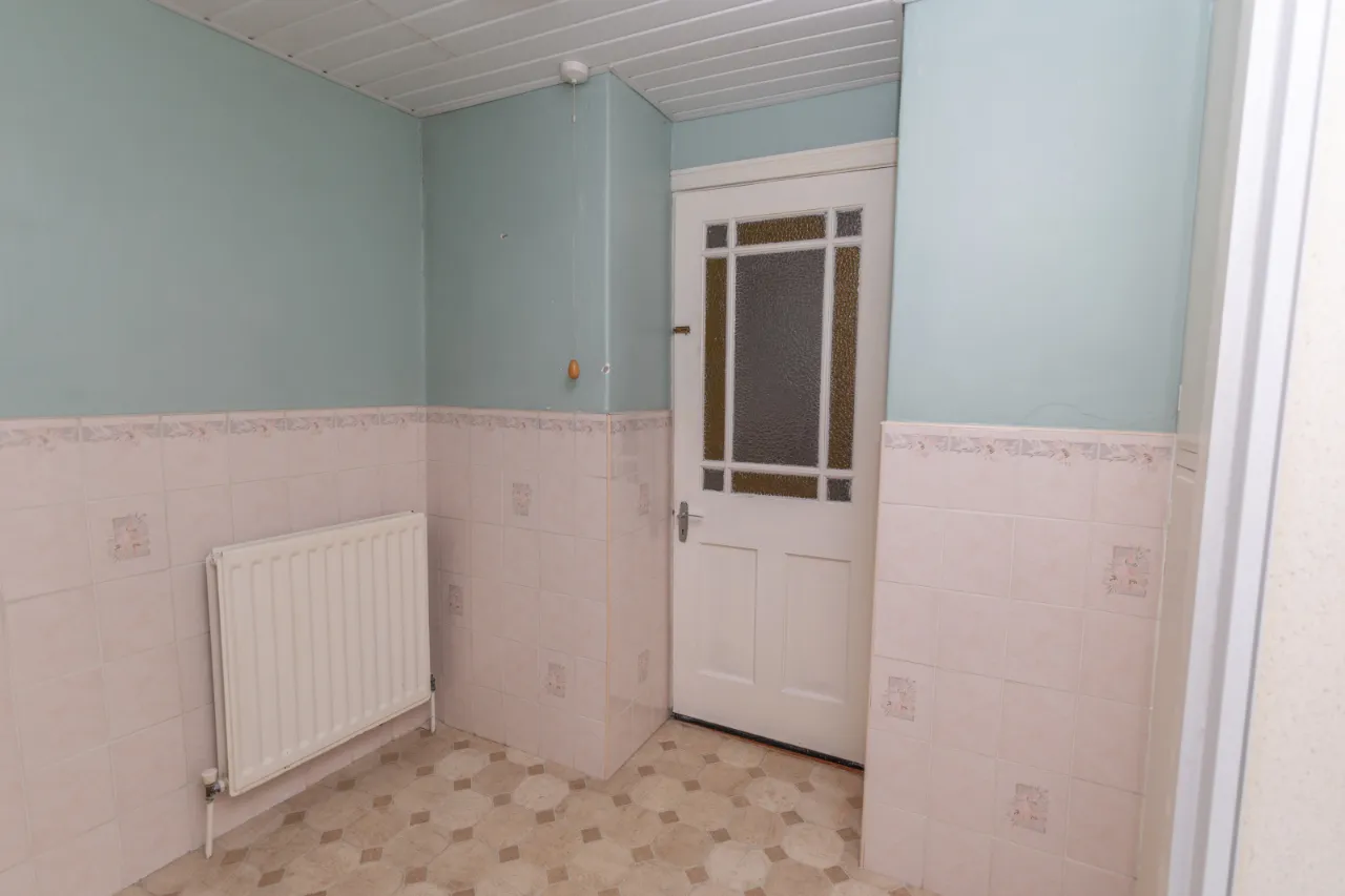 Rear facing, tiled flooring and tiled walls, upper and lower level wood laminate kitchen cupboards, single drainer sink with mixer tap, laminate worktops, space for free standing appliances, extractor fan. Single radiator.