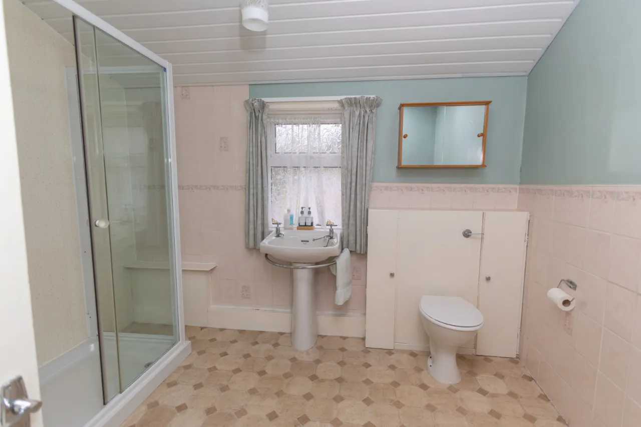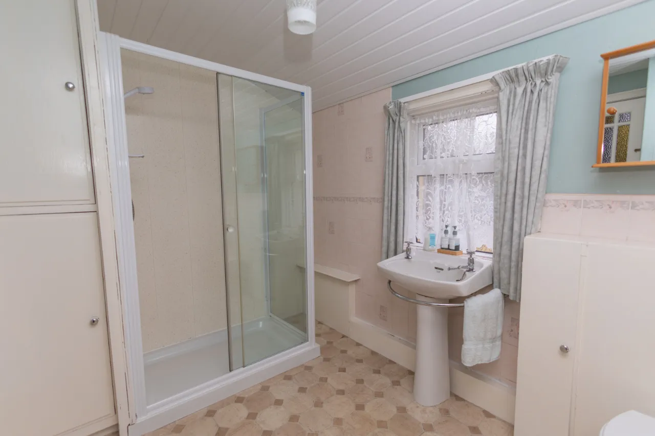 White bathroom suites comprising W.C. and wash hand basin and shower encloure with Mira electric shower. Storage units, vinyl flooring.