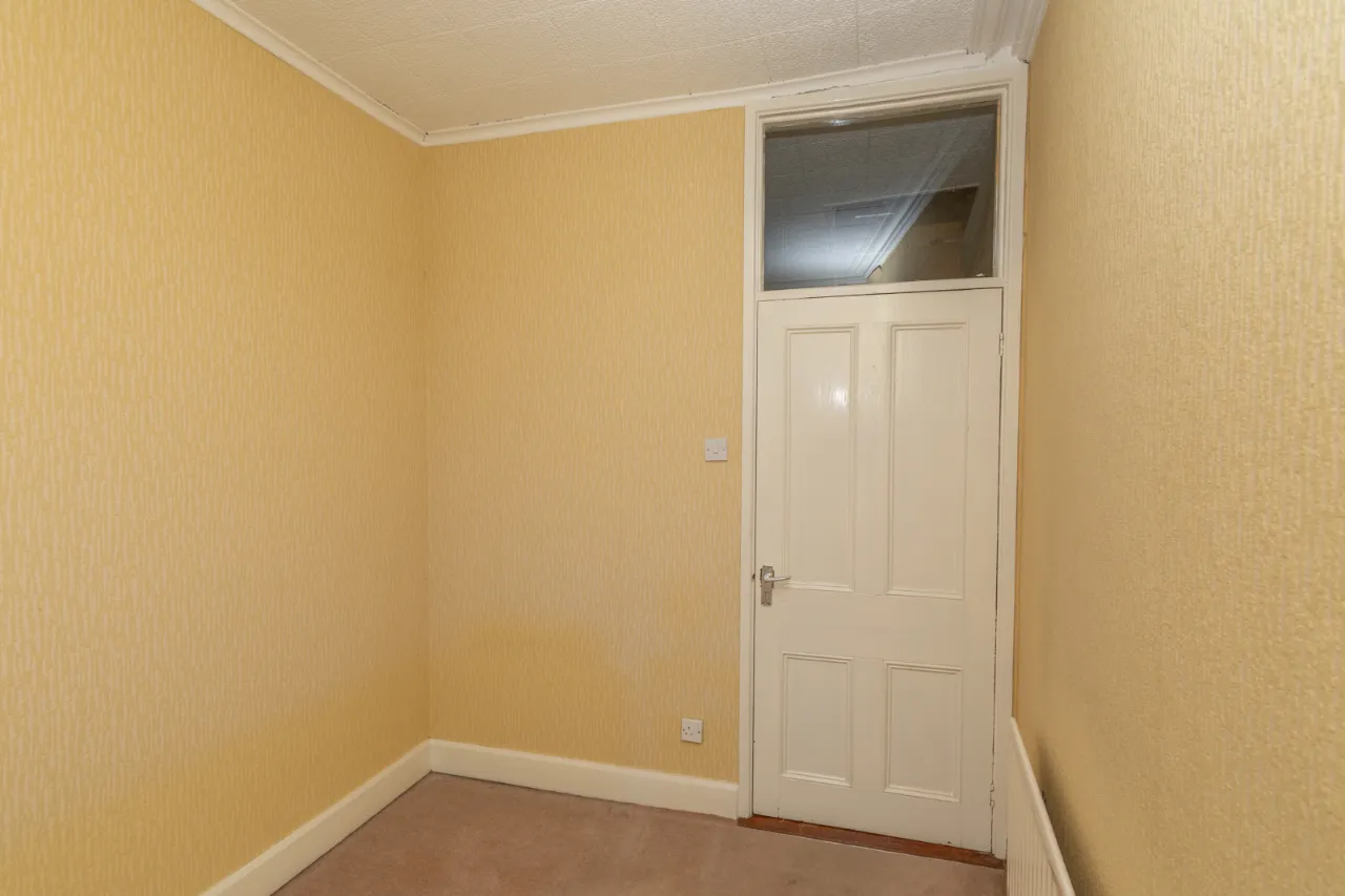 Wooden panelling to walls, vinyl flooring, access to understairs storage and kitchen. Double radiator.