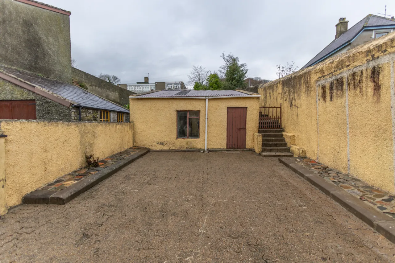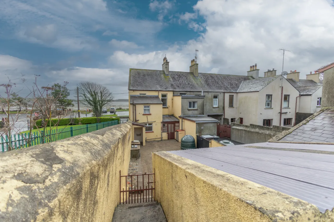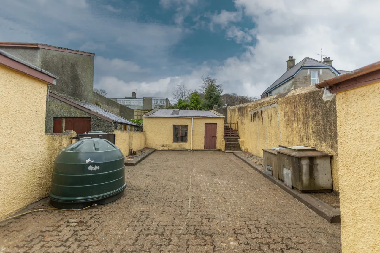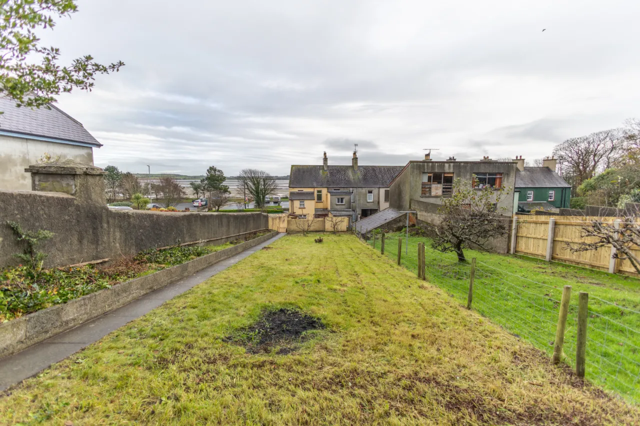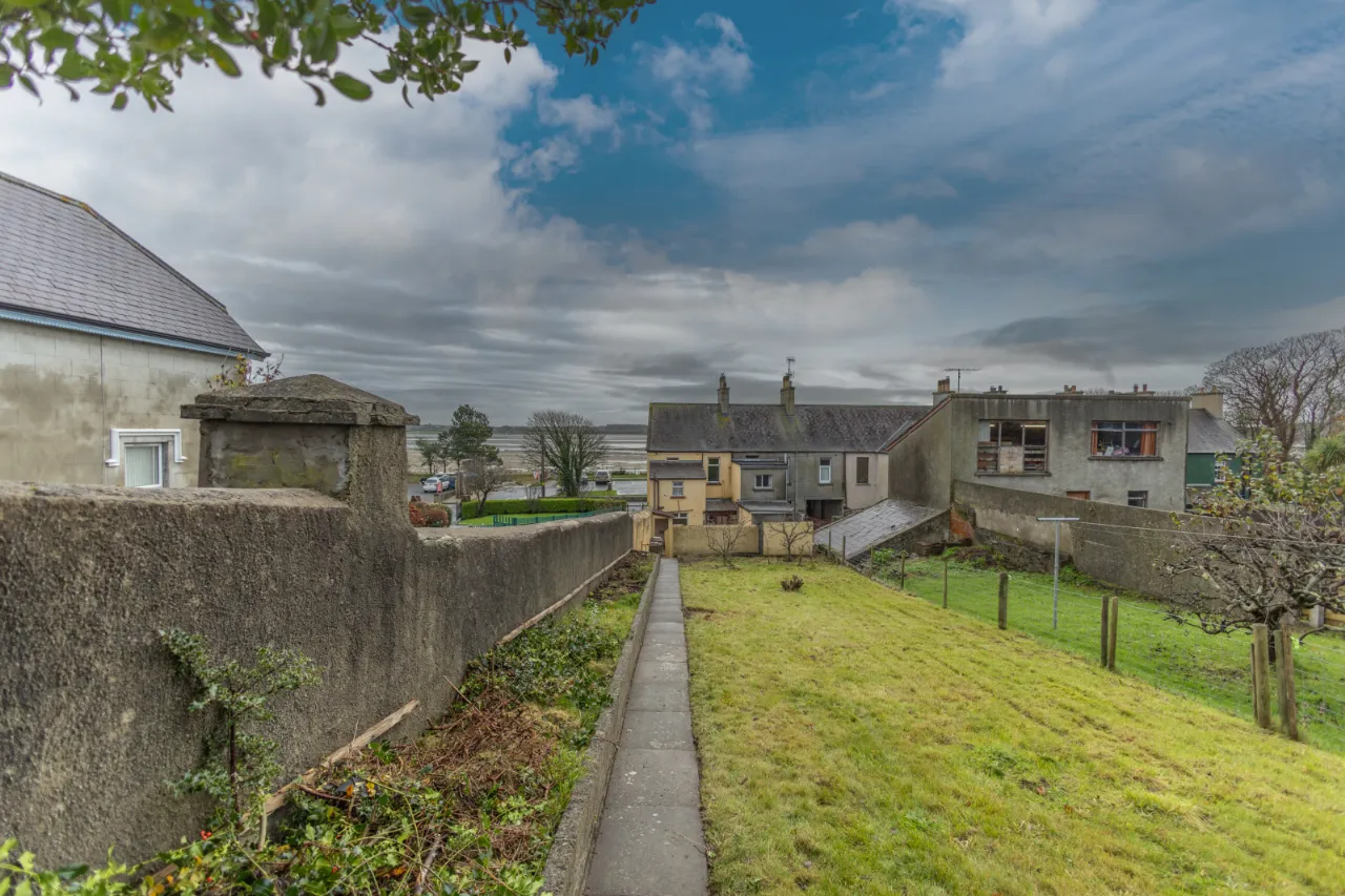 Covered backyard leading to a rear yard with boiler, coal/wood store, and additional outhouse storage, plus a gate providing access for bins. A large rear garden, accessed via steps, is laid in lawn and features mature apple trees and fabulous views over Dundrum Bay.