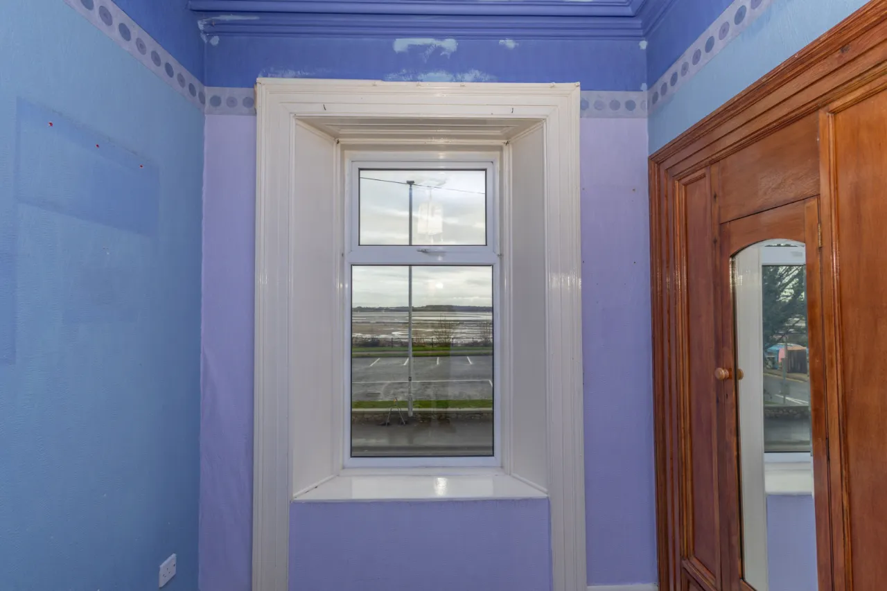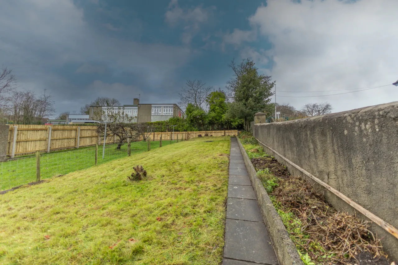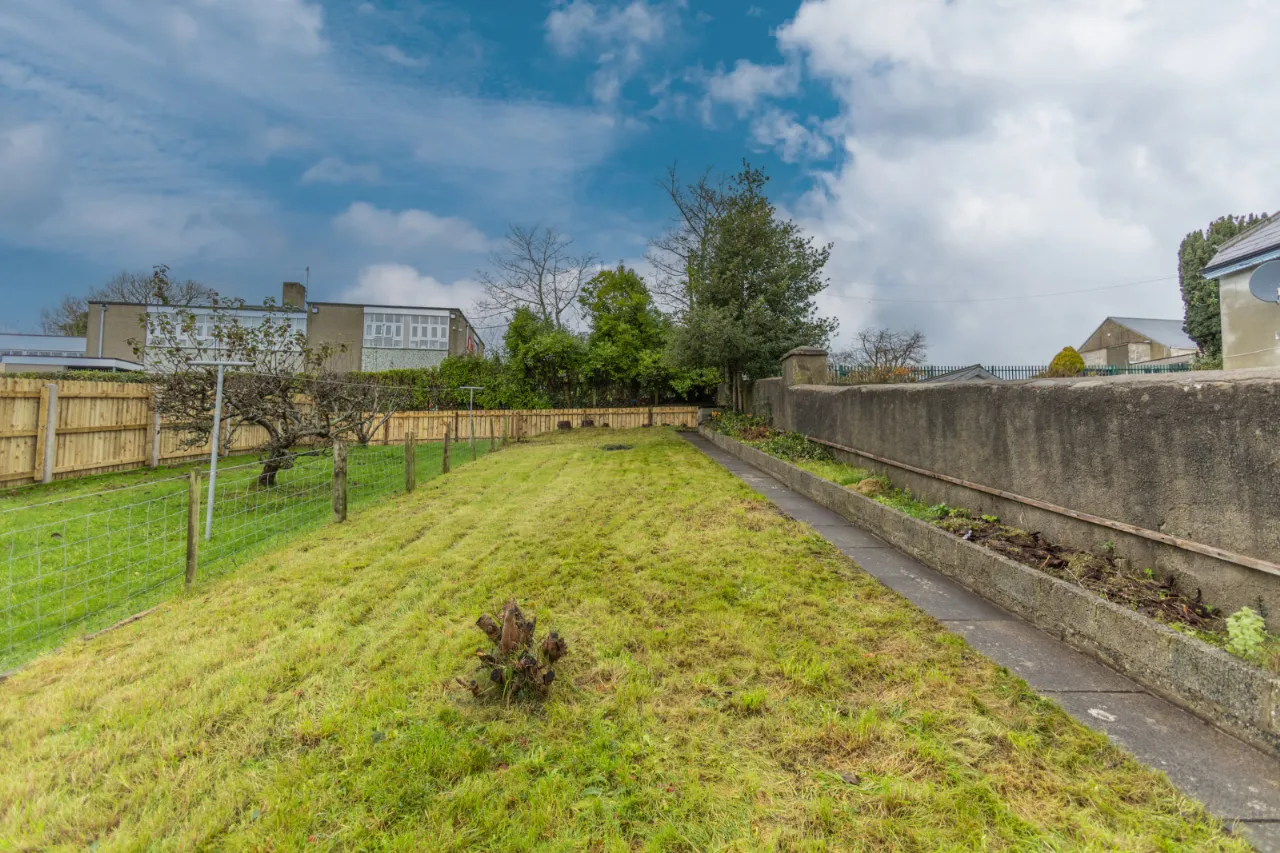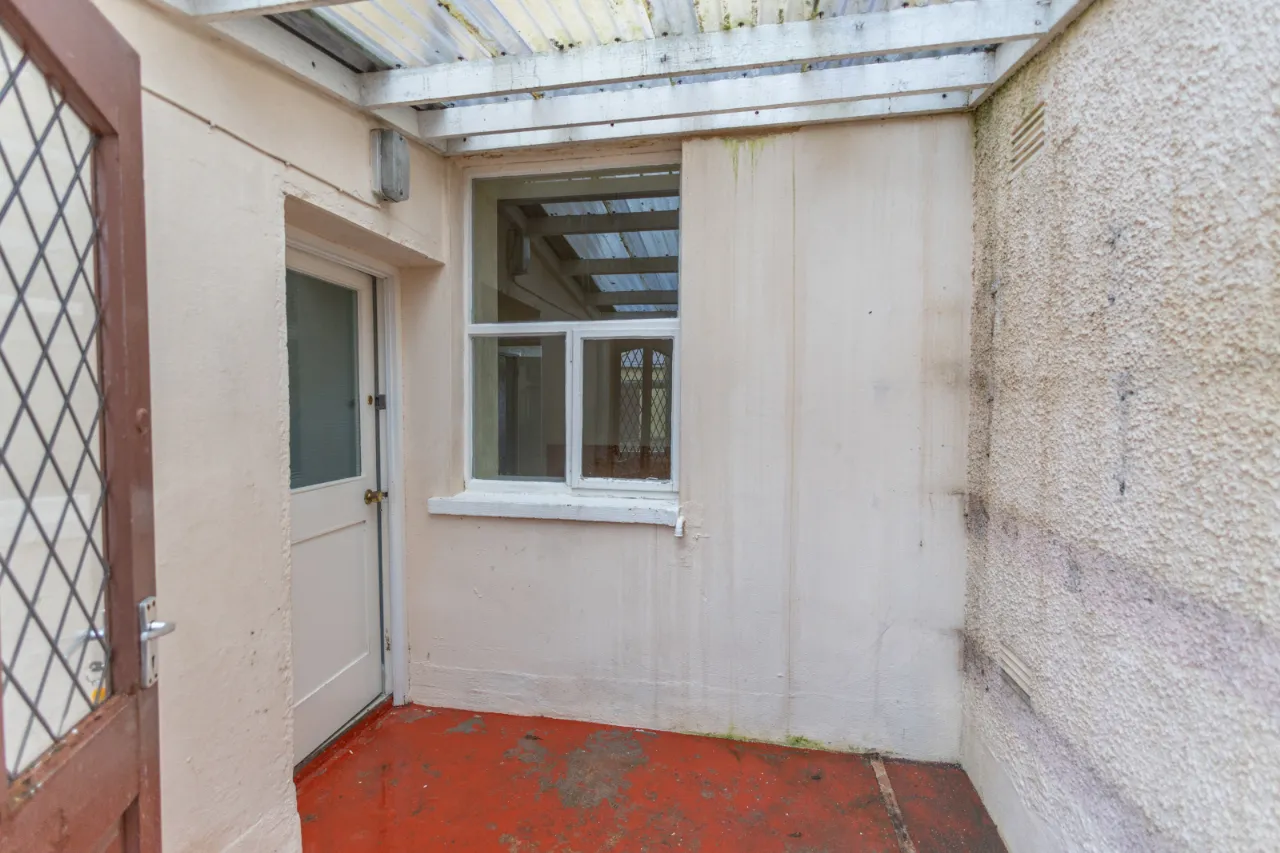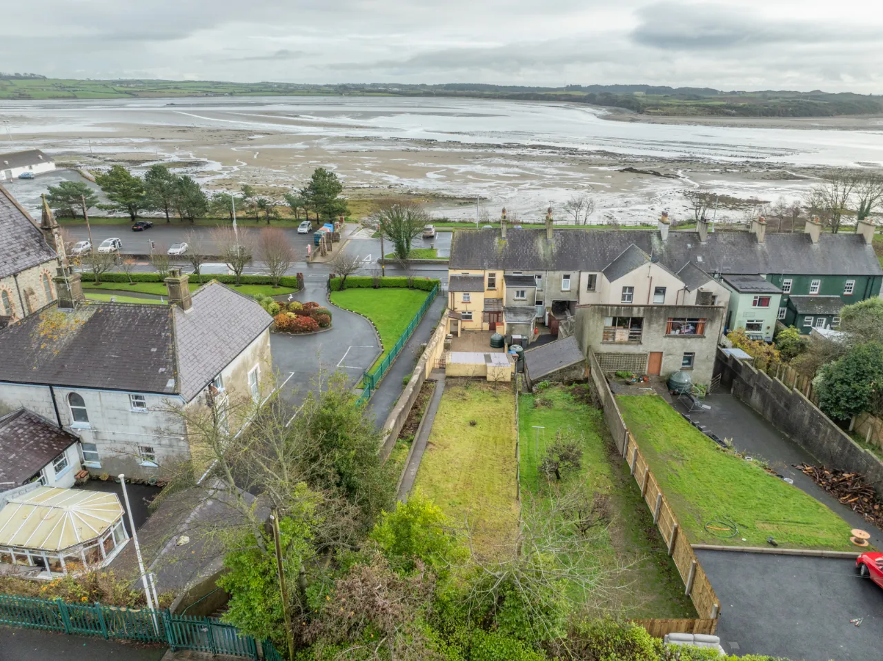 Covered backyard leading to a rear yard with boiler, coal/wood store, and additional outhouse storage, plus a gate providing access for bins. A large rear garden, accessed via steps, is laid in lawn and features mature apple trees and fabulous views over Dundrum Bay.