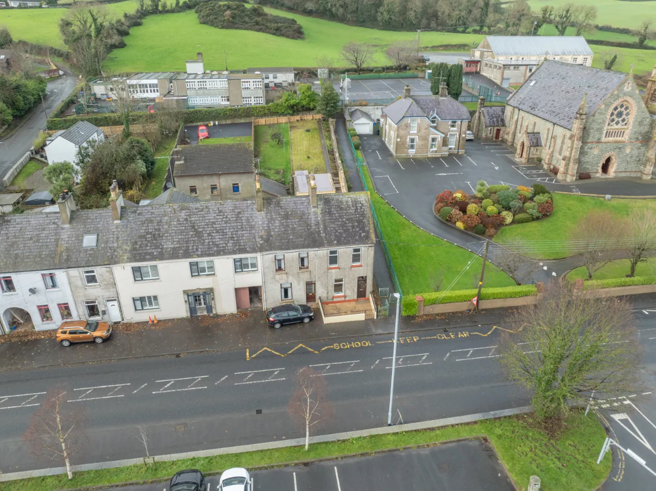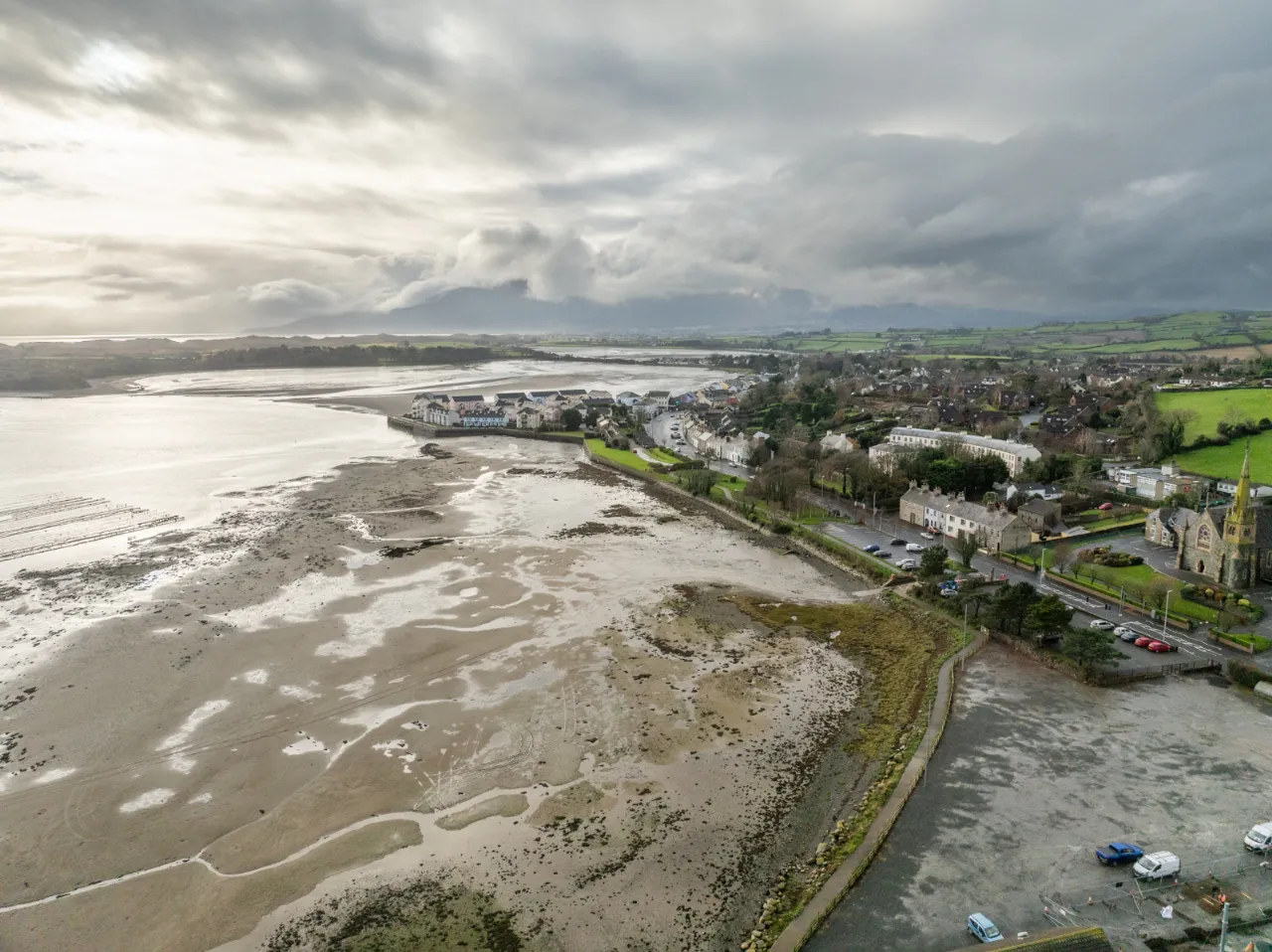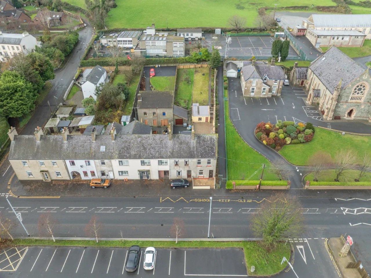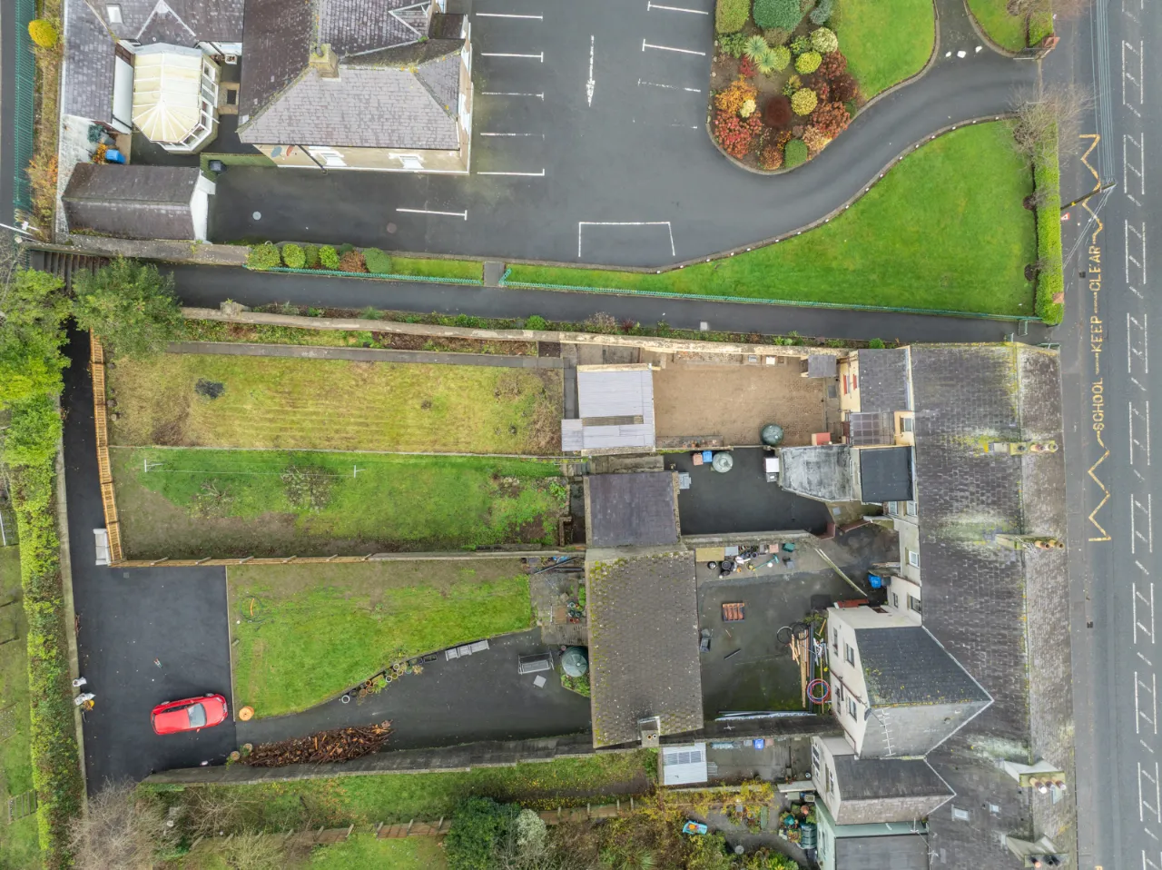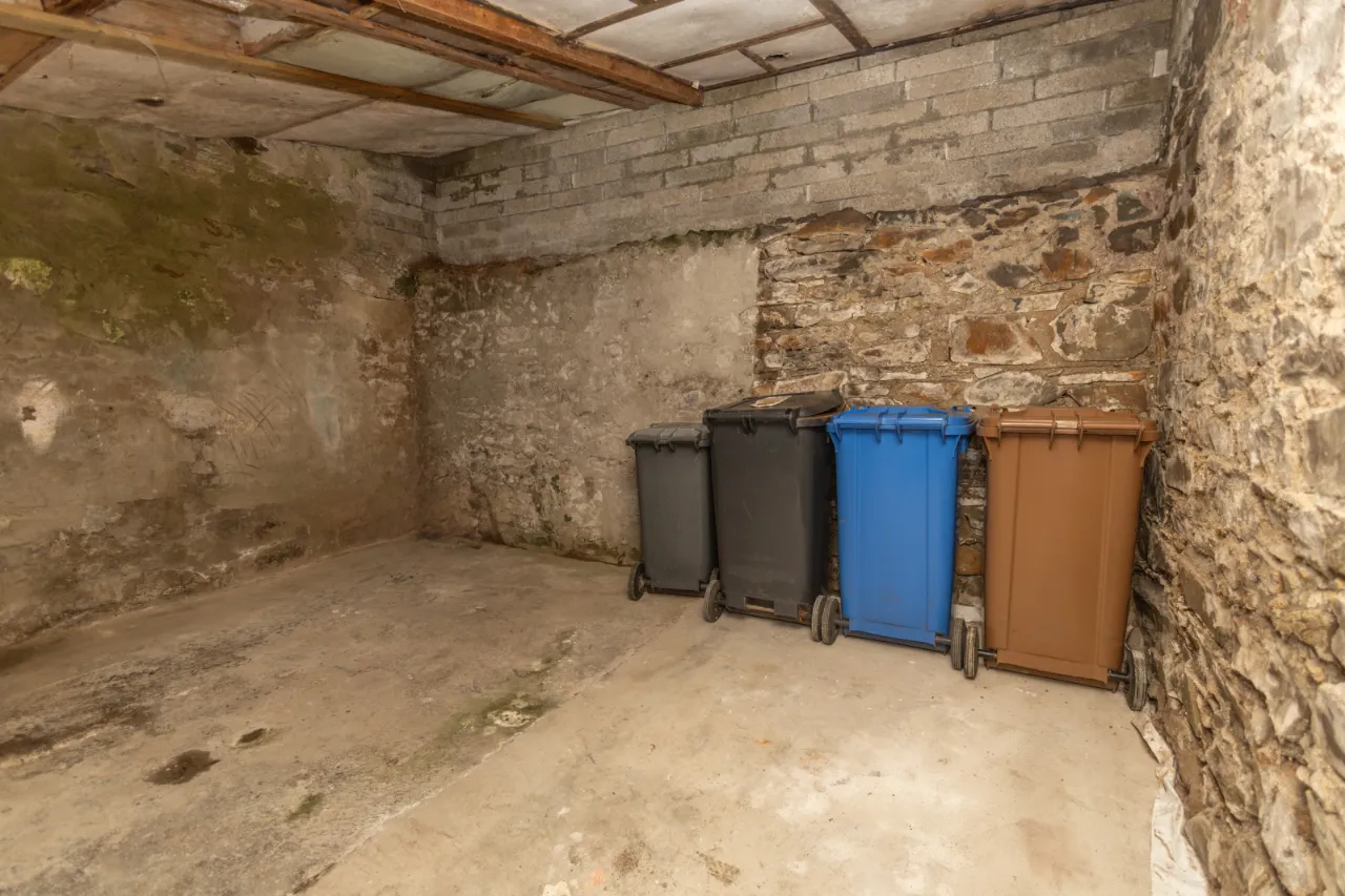 Covered backyard leading to a rear yard with boiler, coal/wood store, and additional outhouse storage, plus a gate providing access for bins. A large rear garden, accessed via steps, is laid in lawn and features mature apple trees and fabulous views over Dundrum Bay.