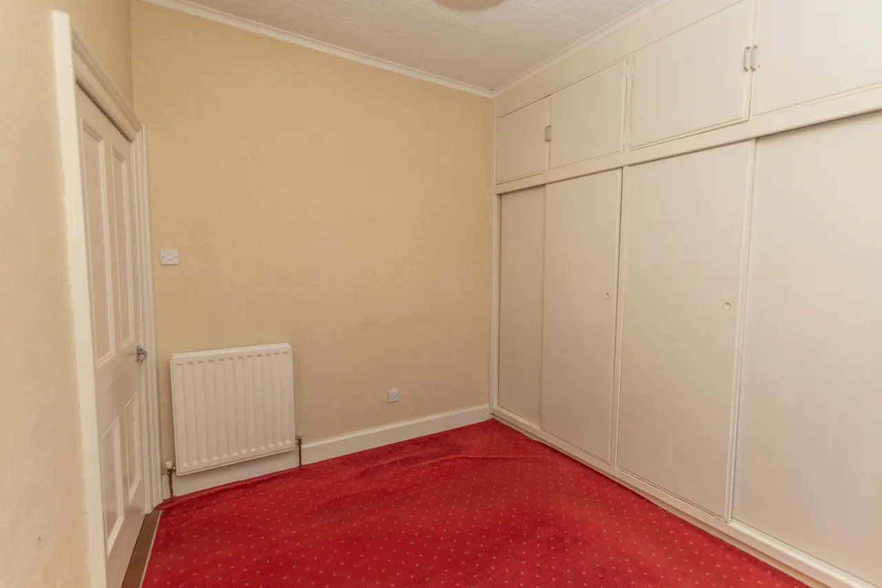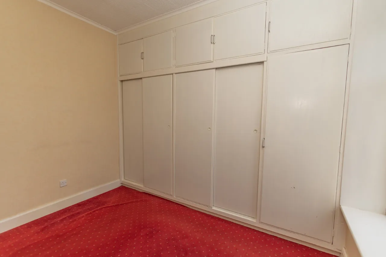 Rear facing, carpeted flooring. Built in cupboards.