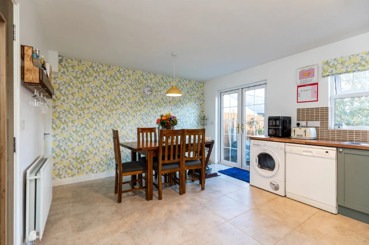 Modern Fitted Kitchen Open Plan To Dining Area With uPVC Doors Leading Outside