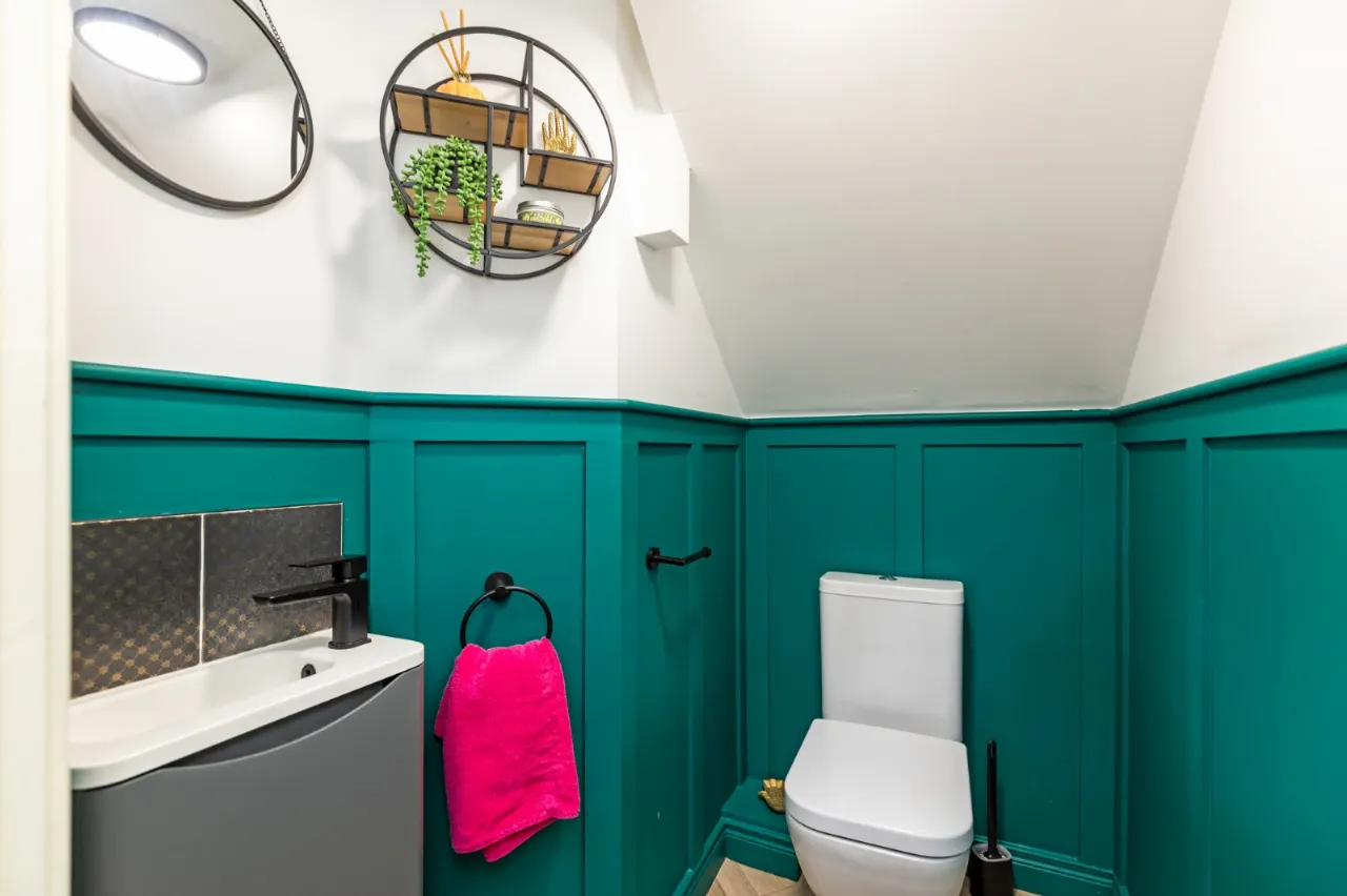 Ceramic tiled floor, low flush WC, pedestal wash hand basin, fully tiled corner shower cubicle, extactor fan, chrome heated towel rail
