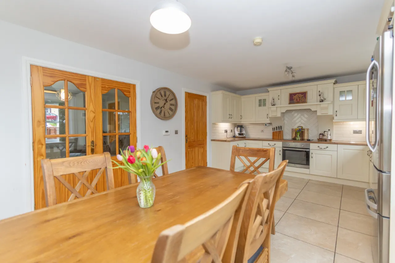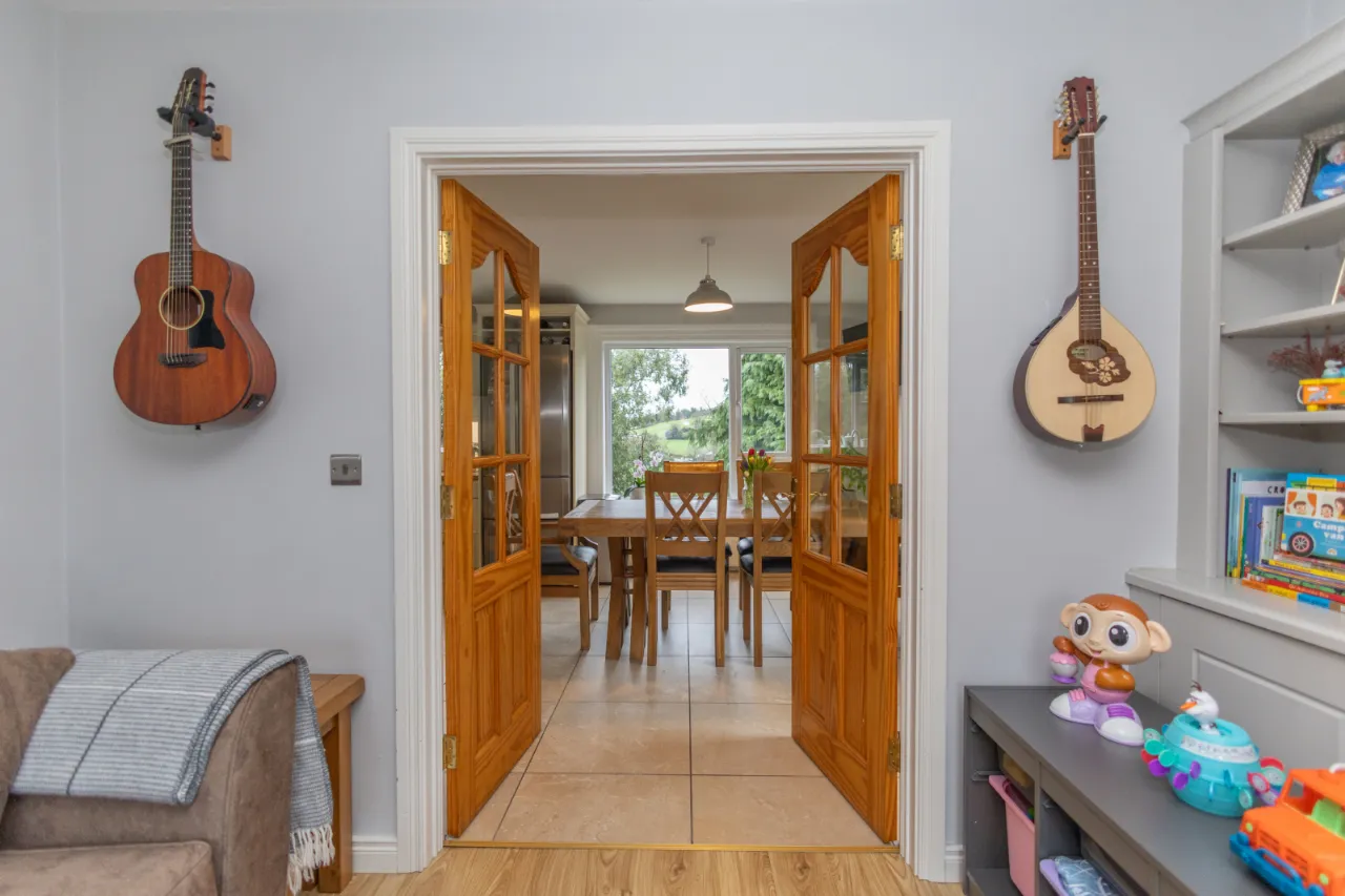 Laminate floor, PVC Double Glazing, built in shelving/ storage units, open fire, tiled hearth with stone effect surround and cast iron inset, double doors leading to kitchen/ dinning room.