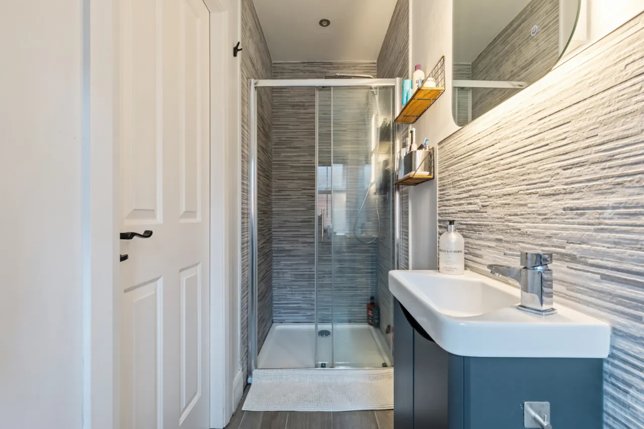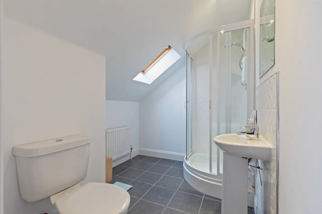 Comprises of enclosed shower unit with shower screen, pedestal wash hand basin with mixer tap and tiled splash back. Low flush WC, tiled floor, recessed lighting and extractor fan.