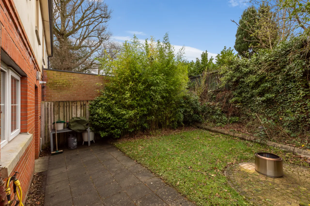 Paved patio area, garden laid in grass, outside tap and light. Driveway parking for two vehicles.