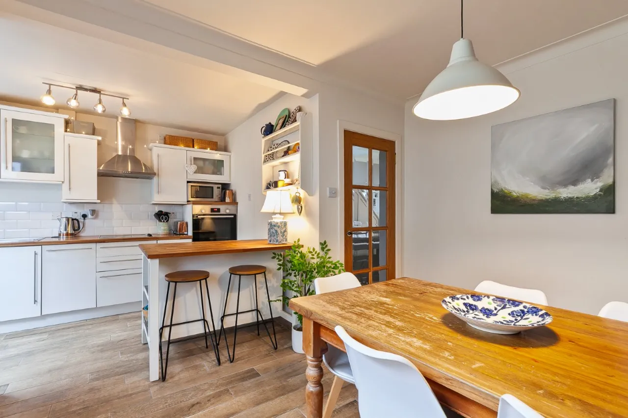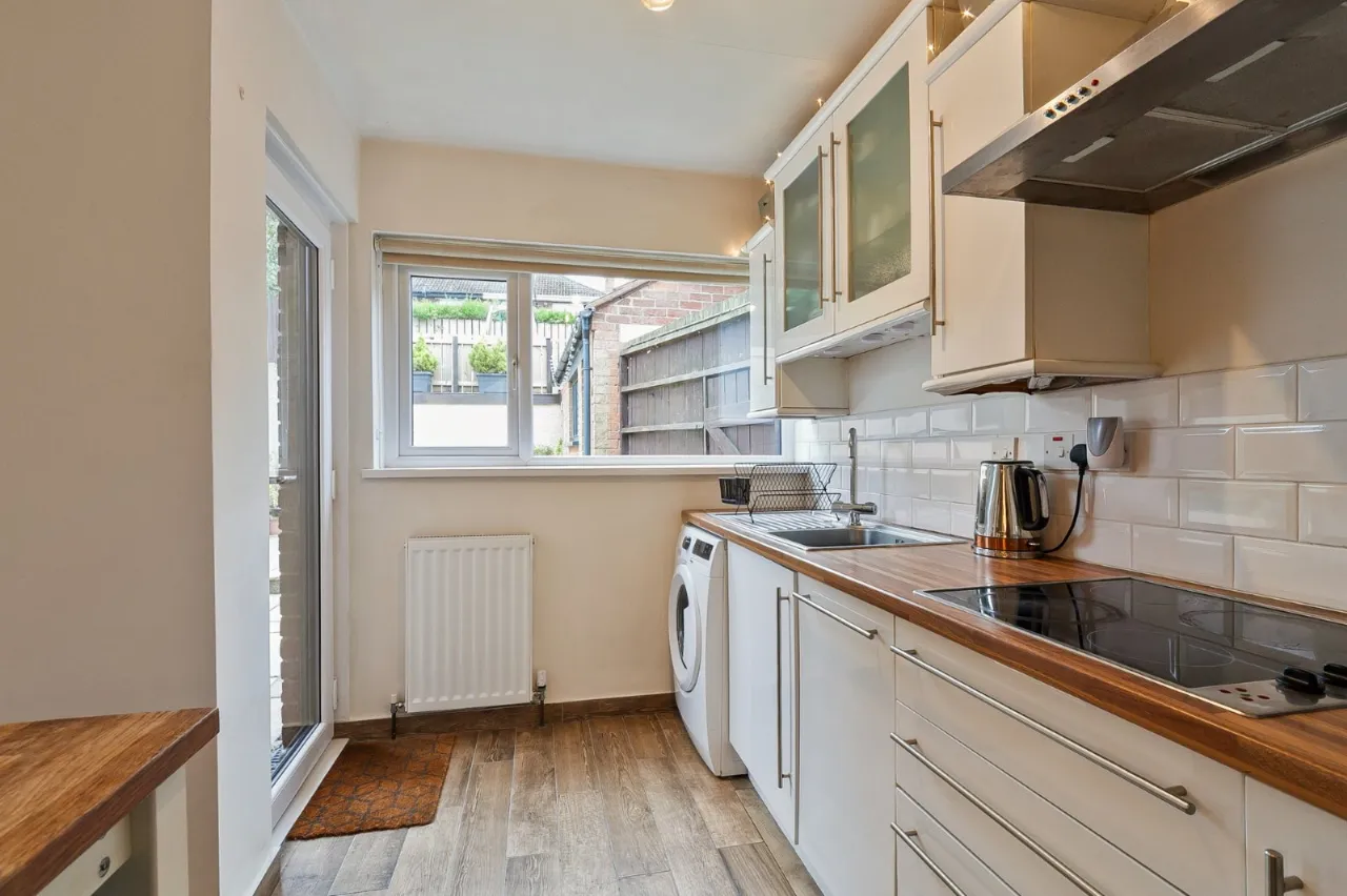 Tiled floor, range of high and low level units, eye-level electric oven, 4 ring ceramic hob, stainless steel extractor fan, integrated dishwasher, stainless steel sink unit, plumbed for washing machine, part tiled walls, uPVC double glazed door leading outside