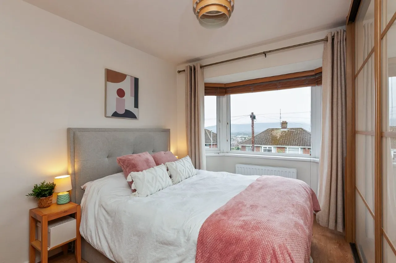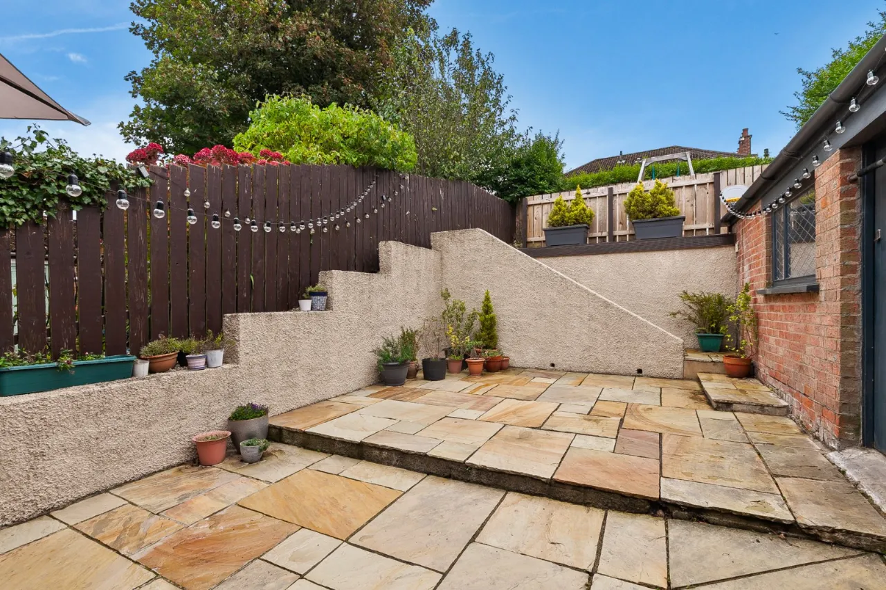 Concrete driveway to the side of the house. Front garden in lawn. Enclosed paved rear garden with steps to decked sitting area