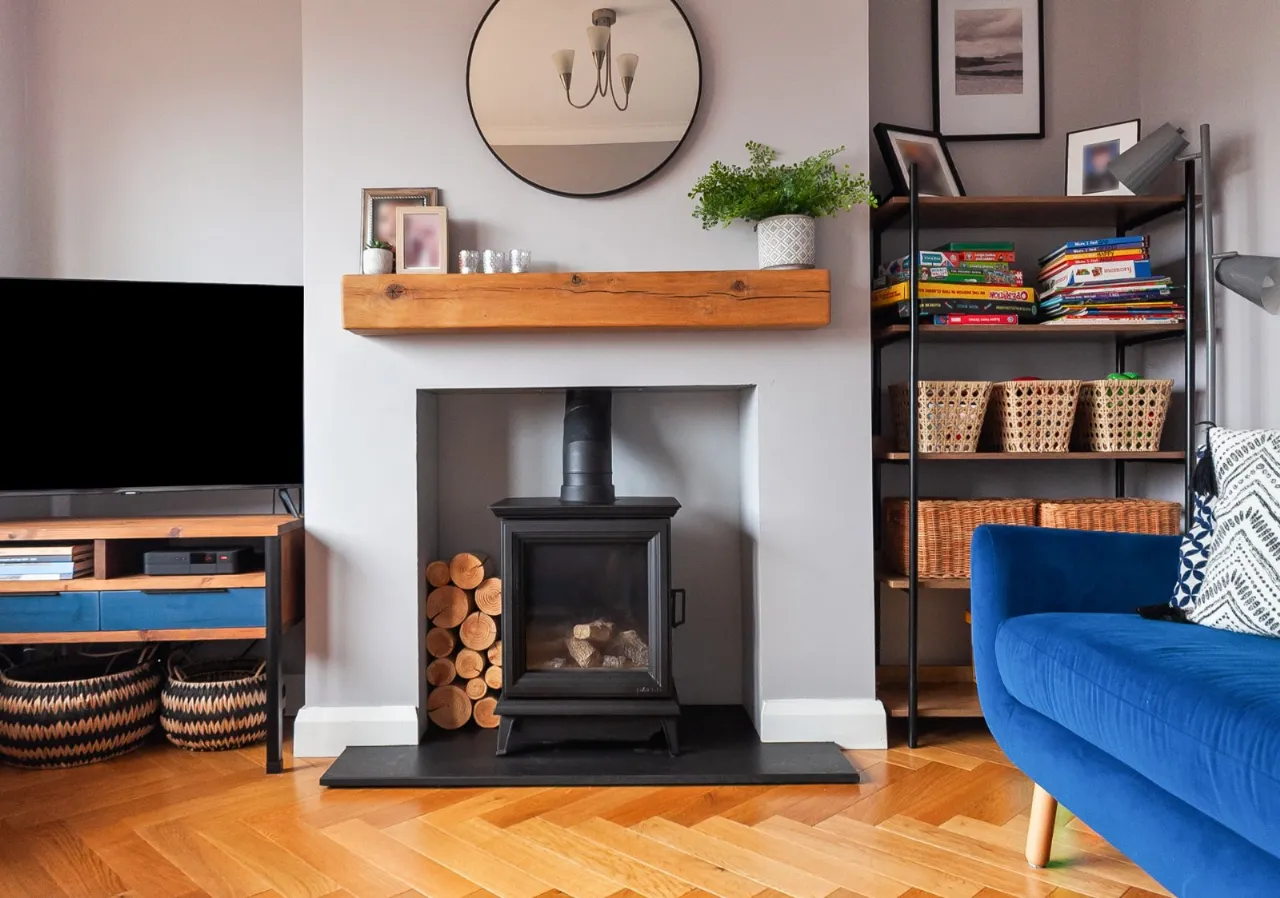 Solid wood parquet floor, remote controlled gas stove with slate hearth and solid wood beam