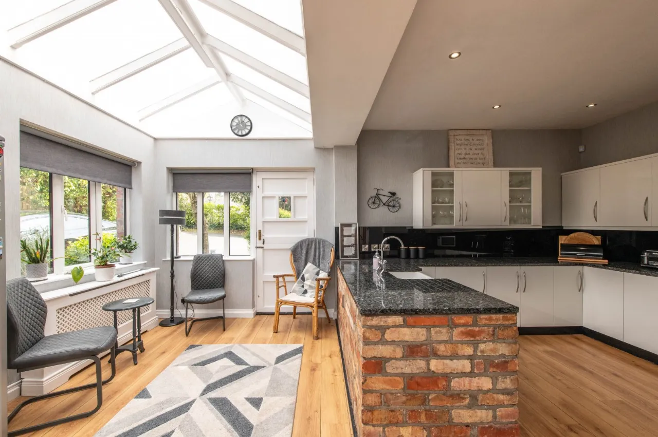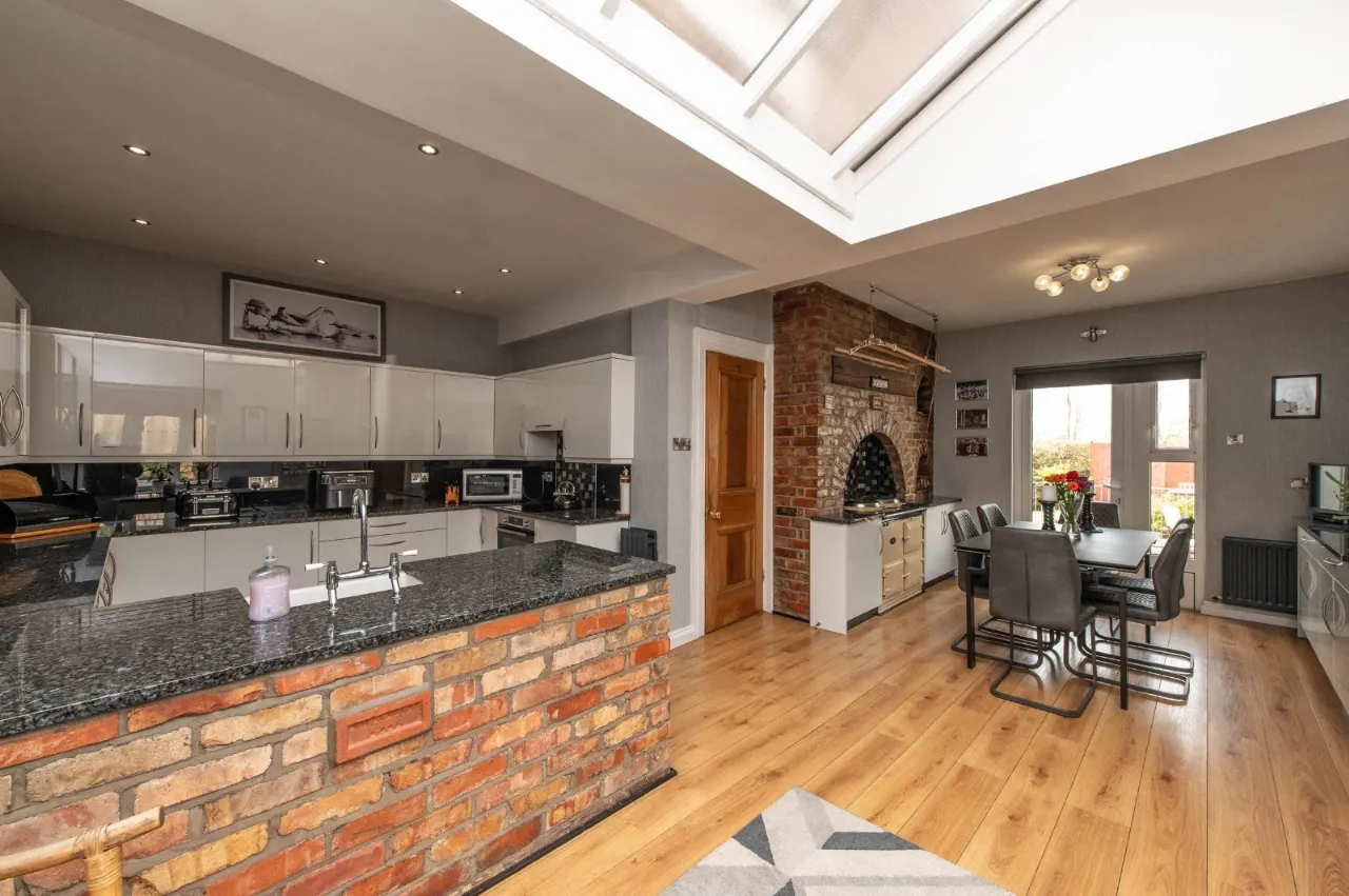 Modern fitted kitchen with range of high and low level units, granite worksurfaces, Belfast sink with mixer tap, built in hob and built in Bosch fan assisted oven, extractor fan, tiling, laminate wood flooring, oil fired aga (providing 24 hour hot water) with feature red brick surround, downlighters, casual lounge/ dining area, feature vaulted ceiling, door to courtyard with patio area, additional access to front of property