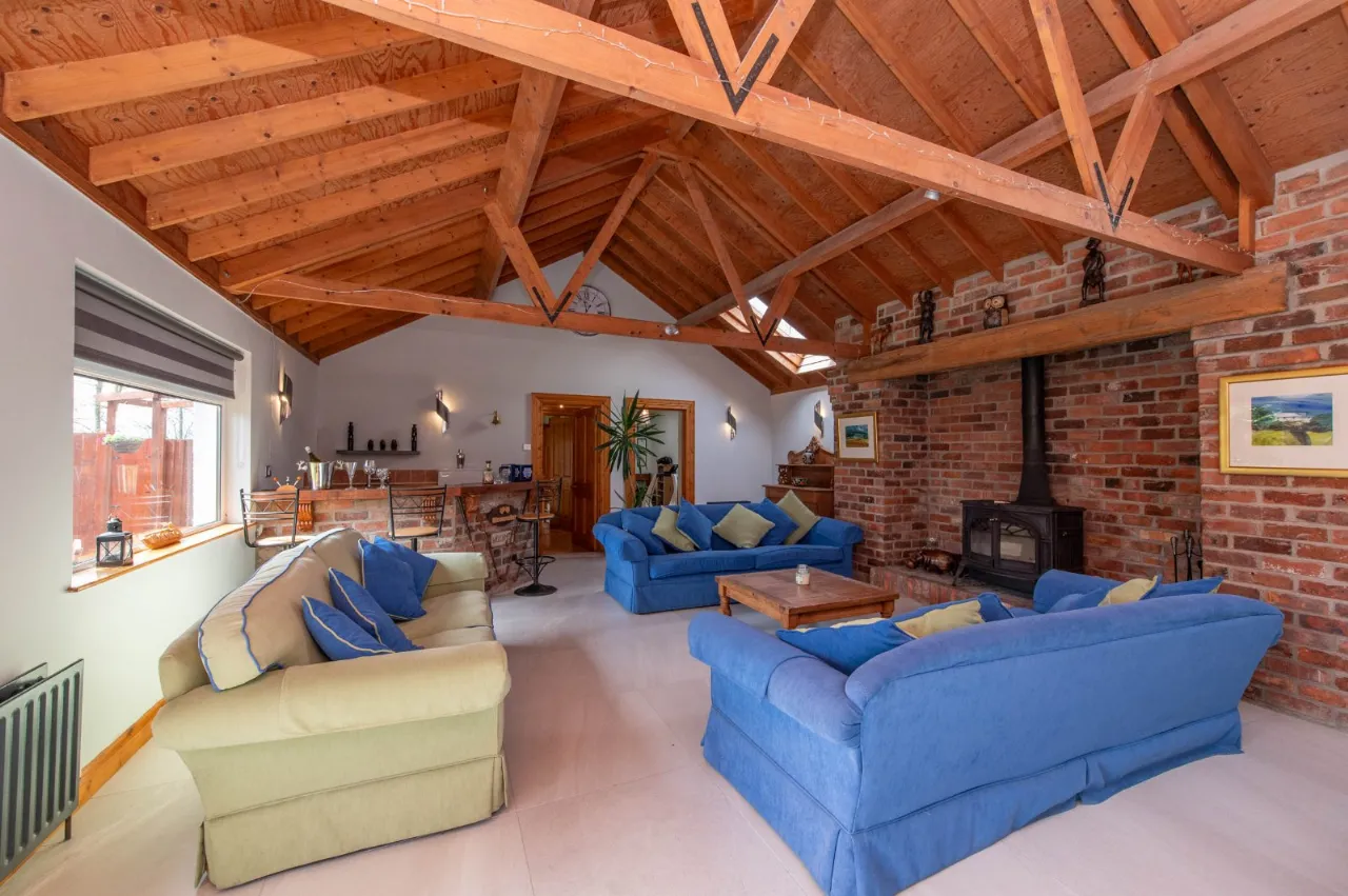 Feature vaulted ceiling, ceramic tiled flooring, log burning stove with feature red brick fireplace, wired for wall lights, Velux window, bar/ kitchen area, French doors to garden