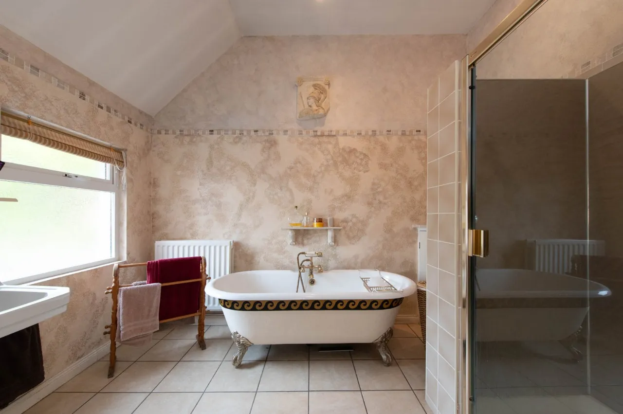 White bathroom suite, low flush WC, bidet, roll top bath with mixer taps and hand shower, glazed shower unit, electric shower, downlighters, hot press with insulated copper cylinder, ceramic tiled flooring