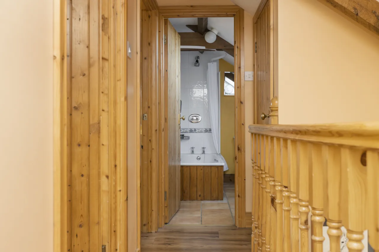 In the living area - ‘Morso’ wood-burning stove. In the kitchen area - full range of high and low level maple units. Stainless steel single drainer sink unit with mixer taps. 4 ring hob with under oven. Freezer. Dishwasher. Partially tiled walls. Ceramic tiled floor.