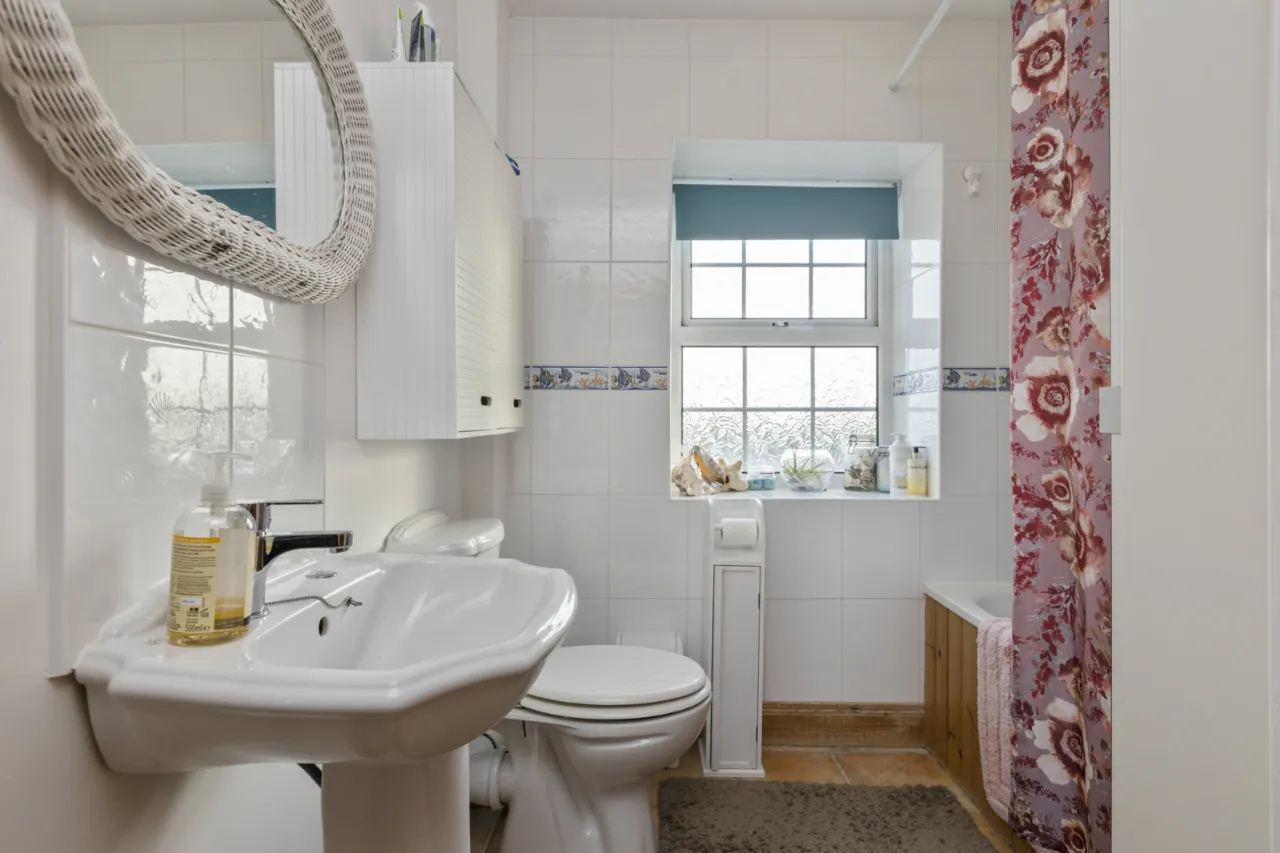 White suite comprising panel bath with thermostatic shower. Low flush WC. Pedestal wash hand basin. Chrome towel radiator.