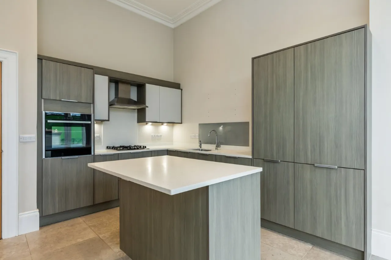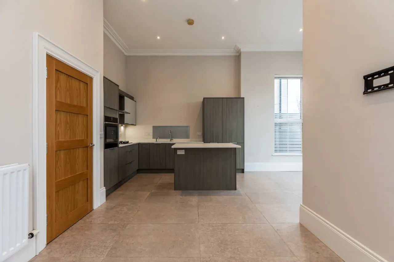 Corniced ceiling, low voltage spotlights.