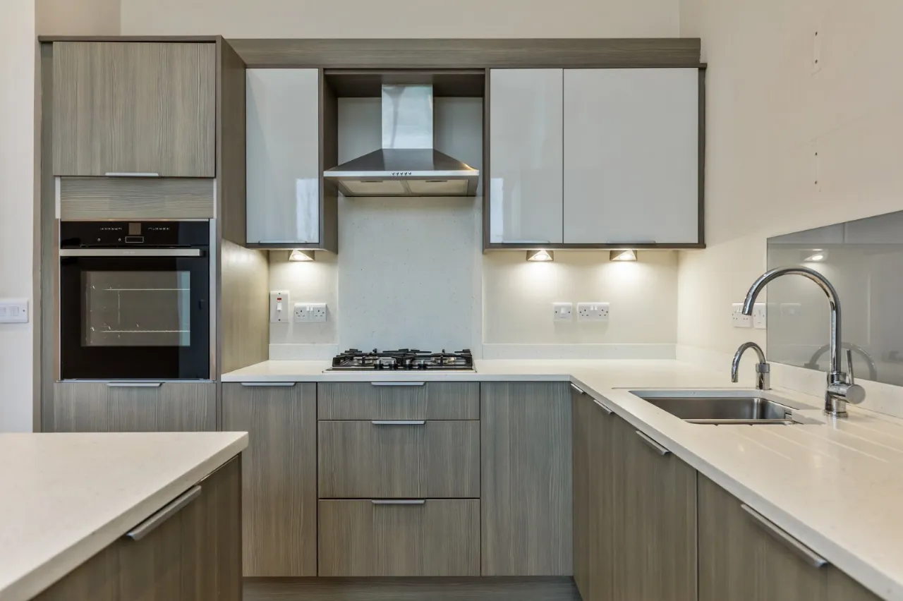 Range of high and low level units, laminate work surfaces, single drainer stainless steel sink unit with chrome mixer taps, extractor fan, low voltage spotlights.