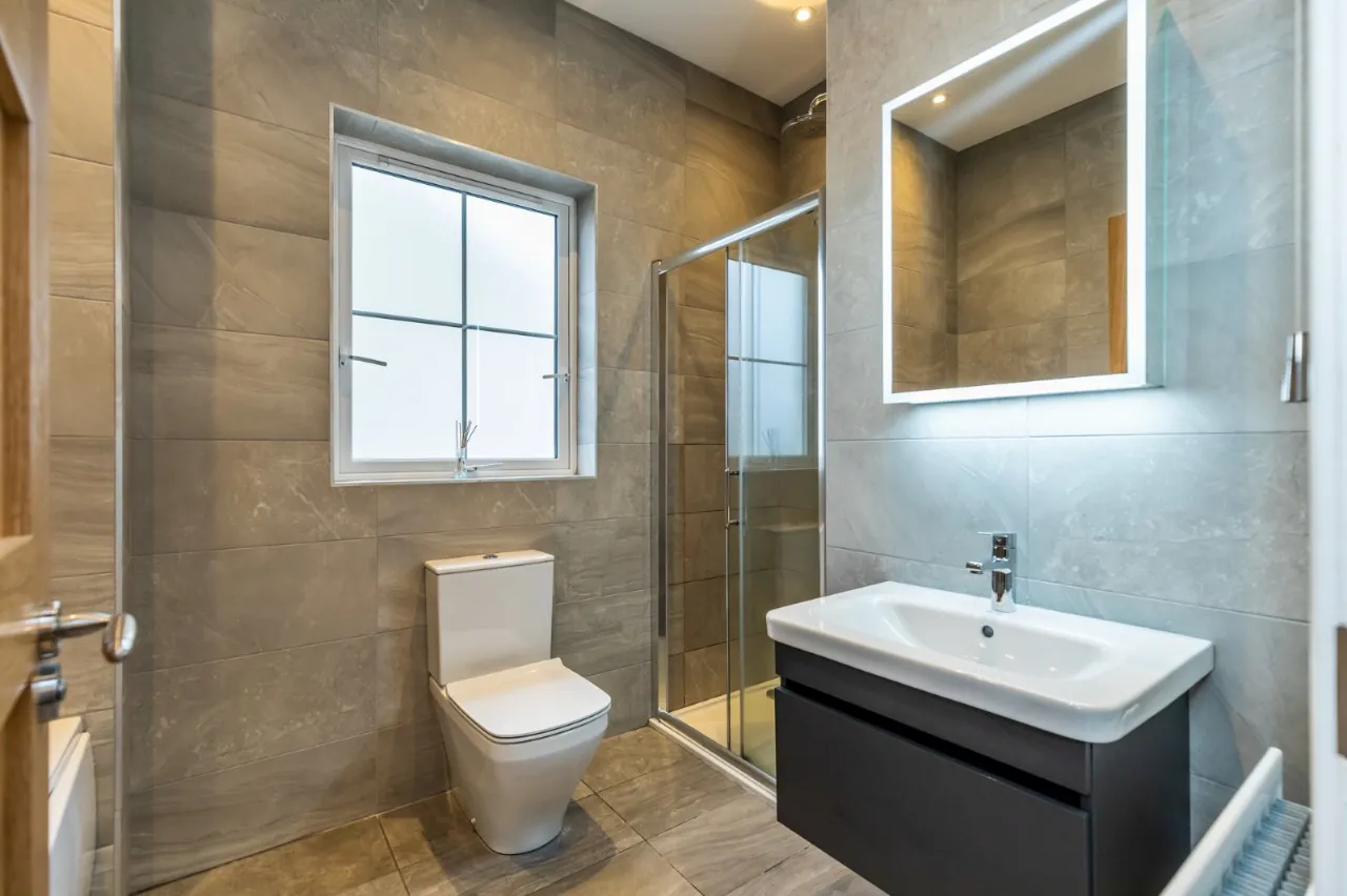 Low flush WC, wash hand basin with chrome mixer taps in vanity unit, fully tiled shower cubicle with chrome thermostatic shower unit.