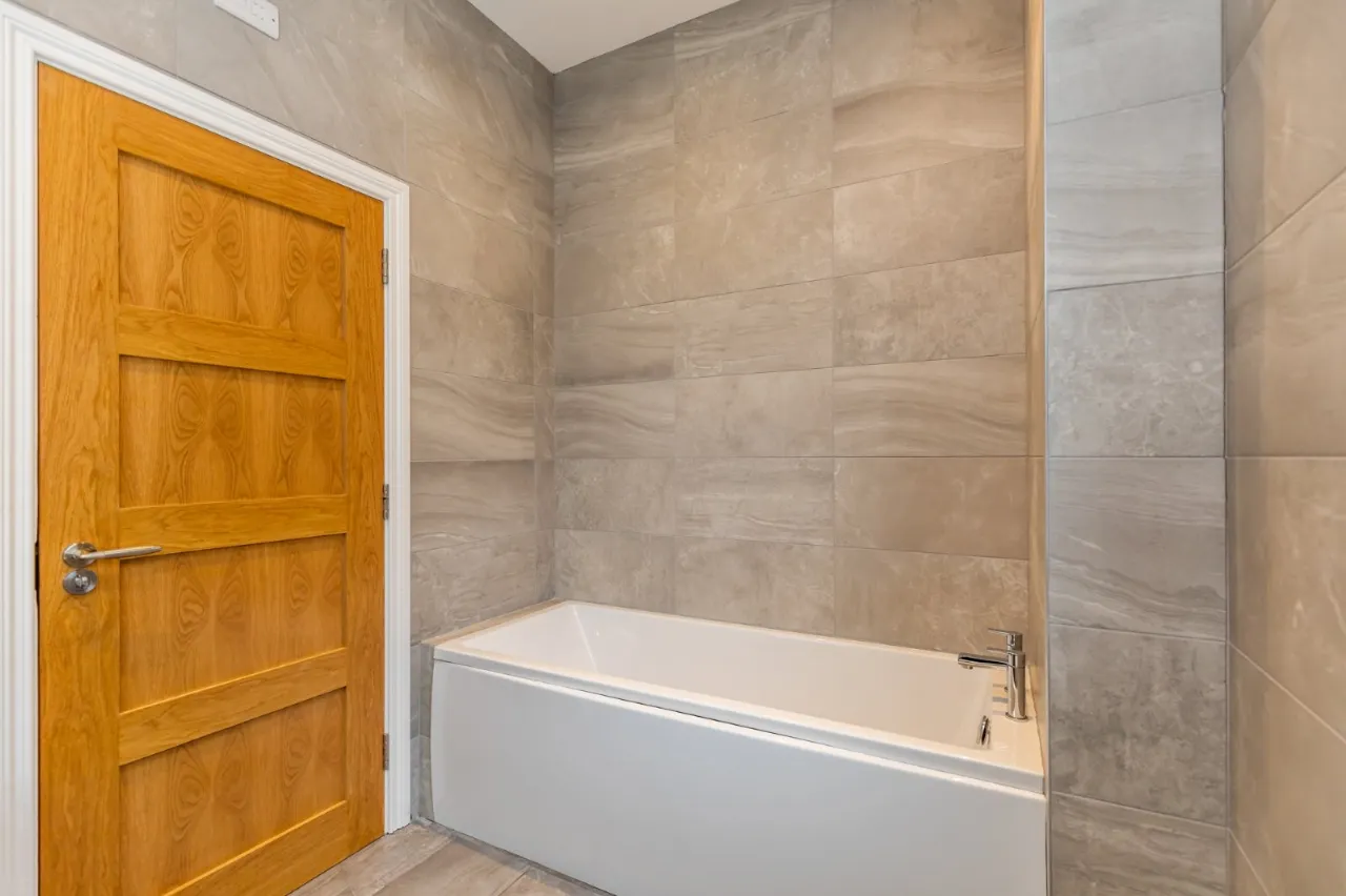 Contemporary white suite comprising: Low flush WC, wash hand basin with chrome mixer taps in vanity unit, panelled bath with chrome mixer taps, fully tiled shower cubicle with chrome thermostatic shower unit, extractor fan, low voltage spotlights. Extractor fan.