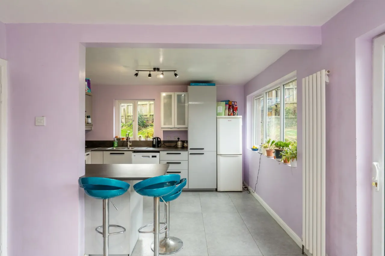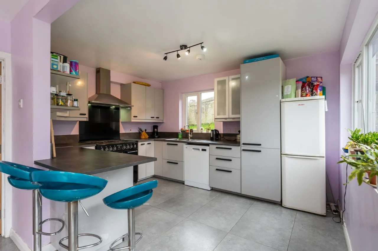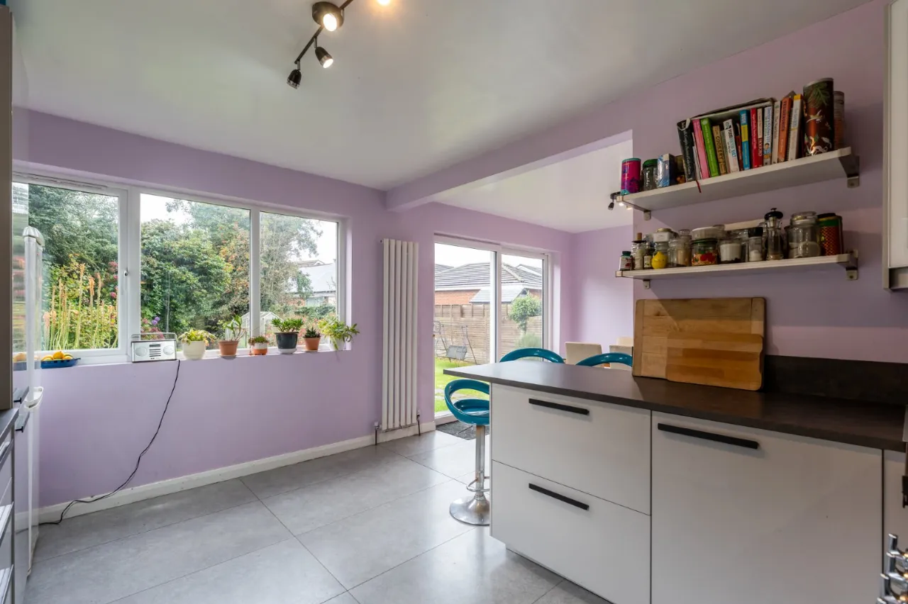 Range of high and low level units, laminate work surfaces, built in breakfast bar, space for range cooker, space for fridge freezer, single drainer stainless steel sink unit with chrome mixer taps, ceramic tiled floor, uPVC double glazed sliding doors to garden.