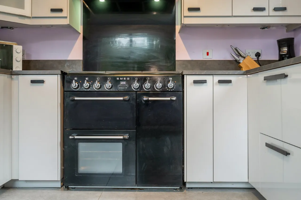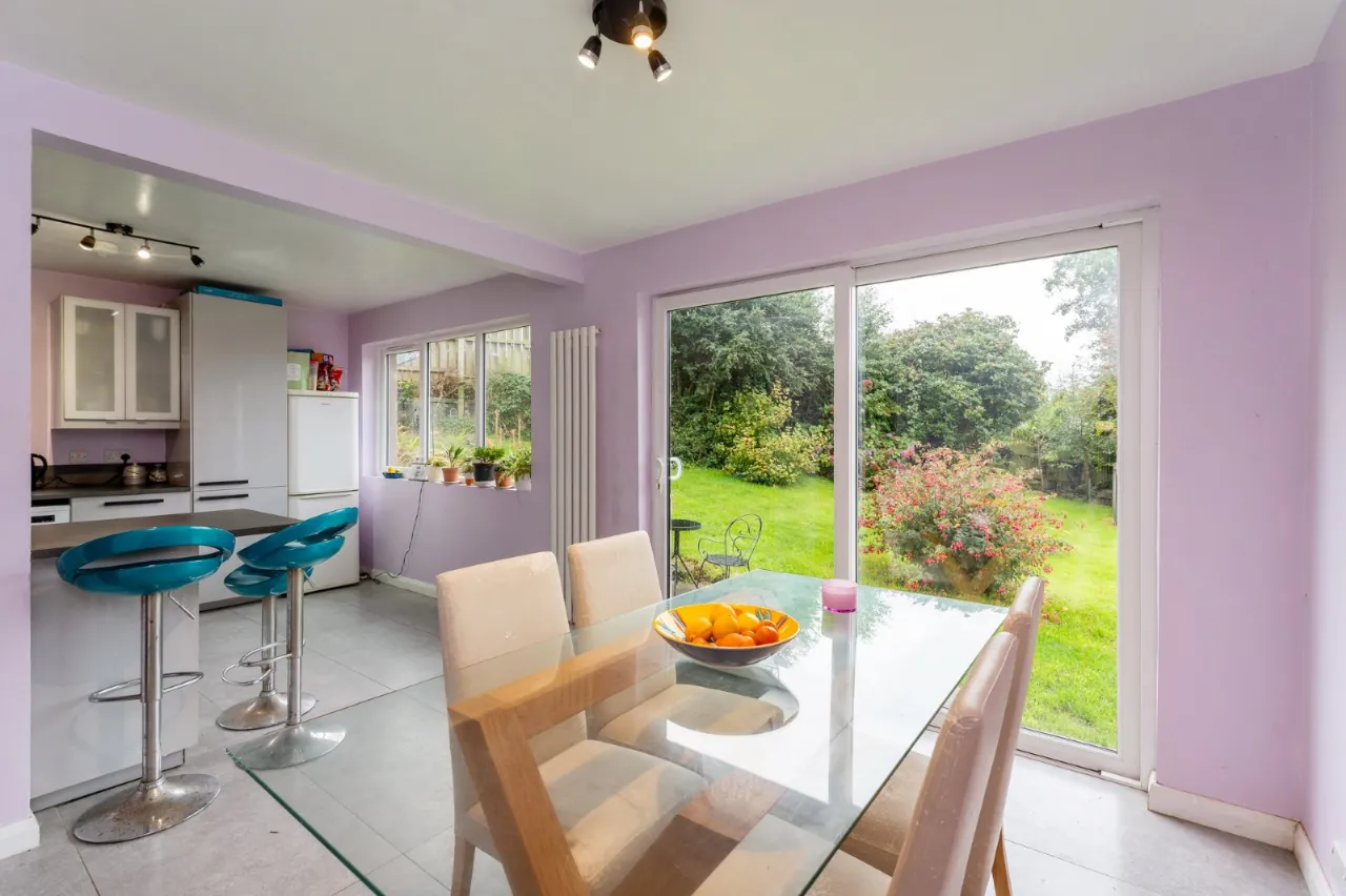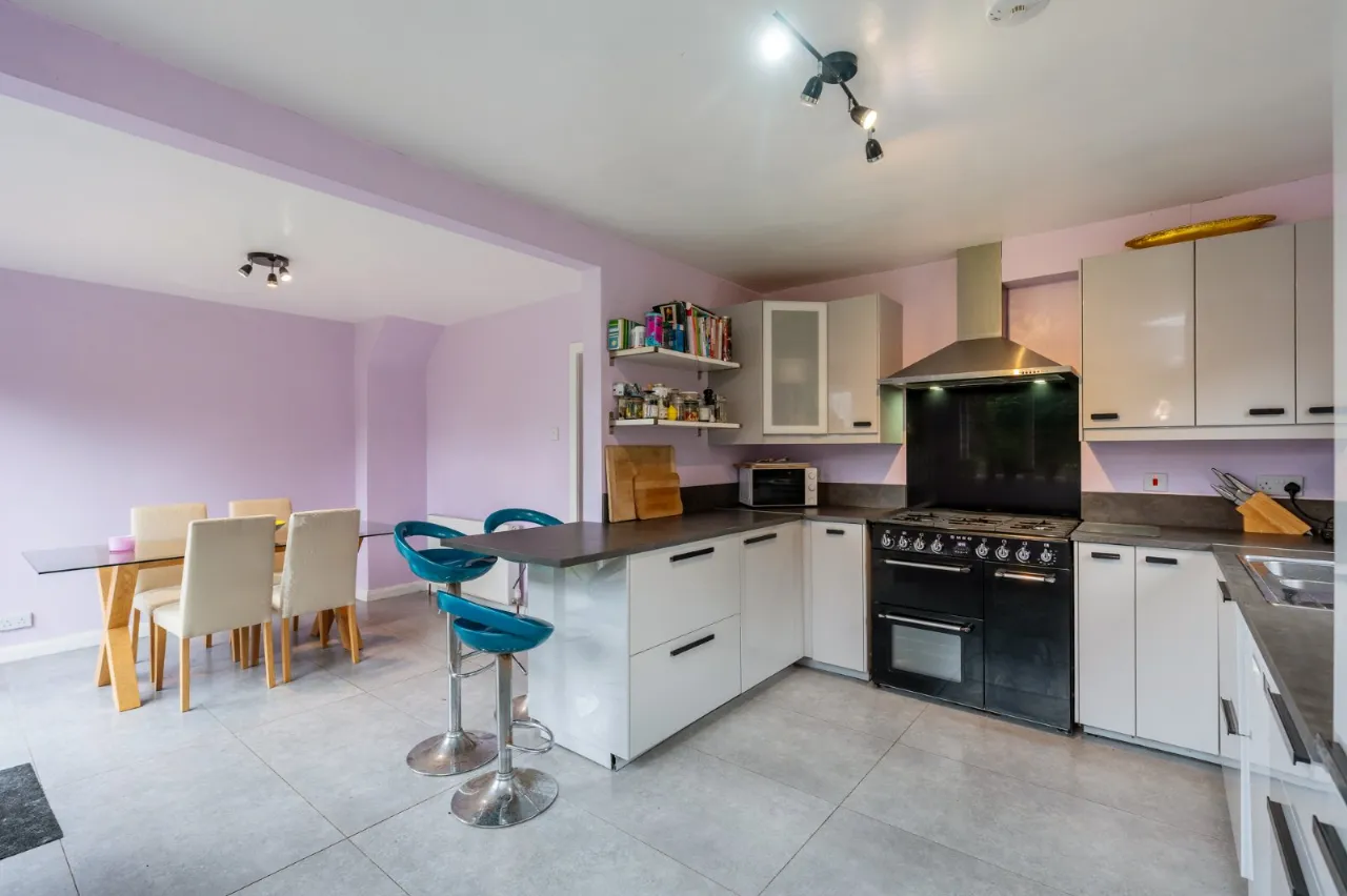 Range of high and low level units, laminate work surfaces, built in breakfast bar, space for range cooker, space for fridge freezer, single drainer stainless steel sink unit with chrome mixer taps, ceramic tiled floor, uPVC double glazed sliding doors to garden.