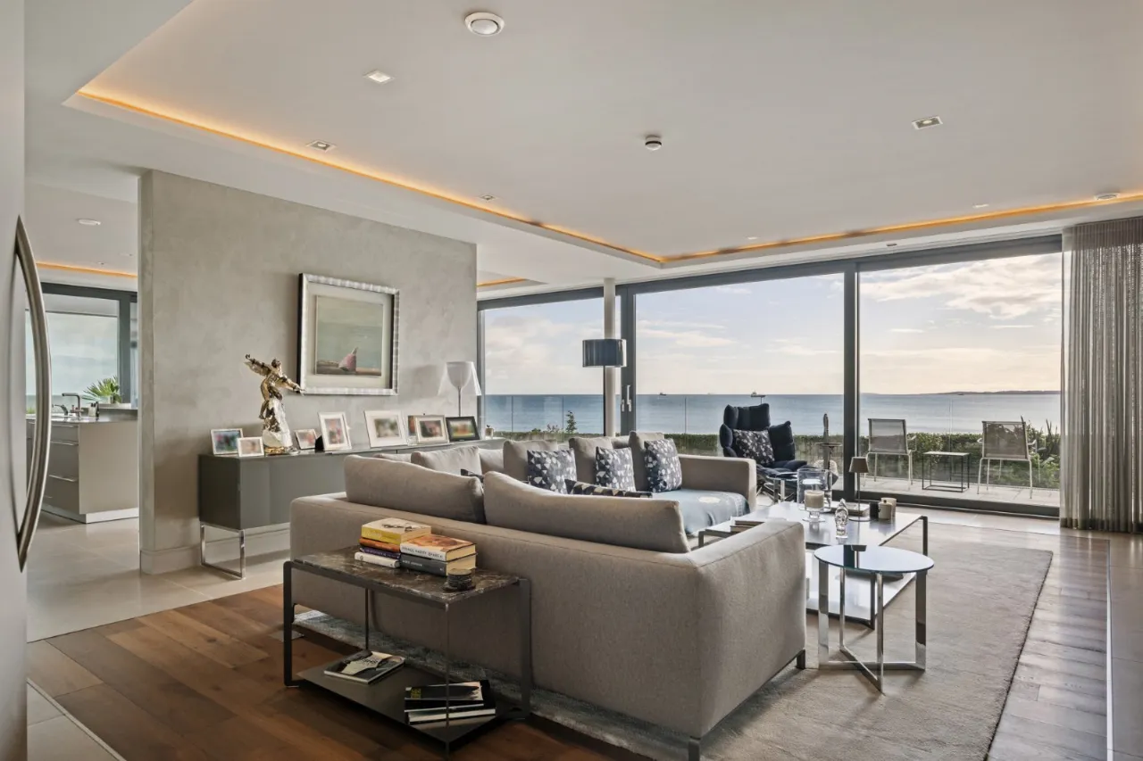 Engineered wood flooring. Full length windows with sliding doors to private terrace. Views along Helen's Bay Beach, North Down Coastline to the Copeland Islands, County Antrim shoreline and Helen's Bay Golf Course. Built in wardrobes.