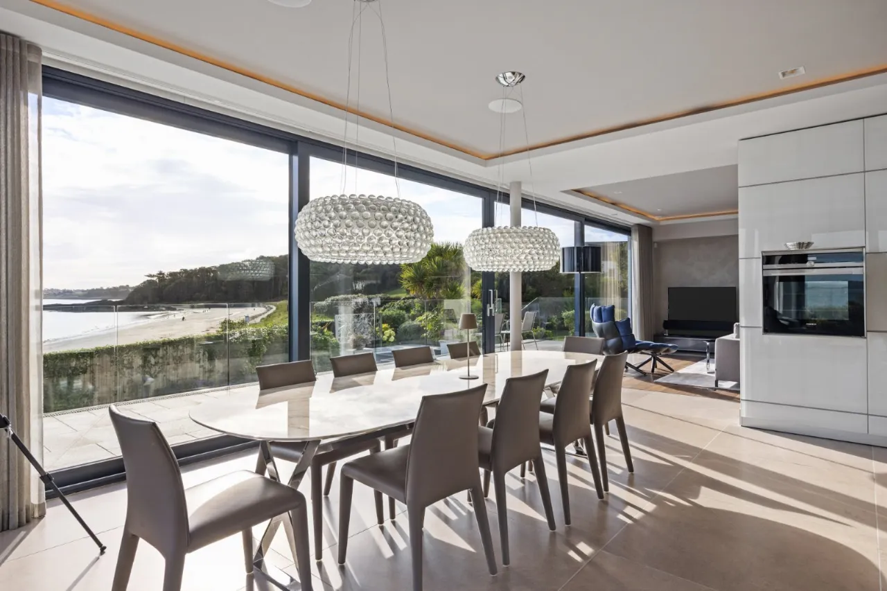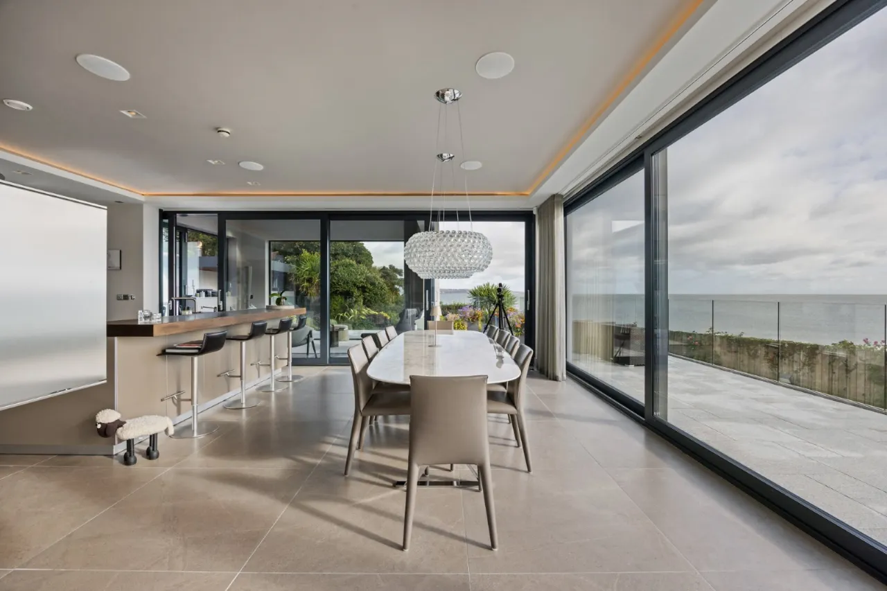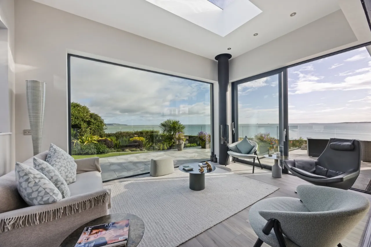 Full length windows with sliding doors to large paved terrace, uninterrupted views along Helen's Bay Beach, North Down Coastline to the Copeland Islands and County Antrim shoreline, feature floating fireplace with gas fire, ceramic tiled floor with central wooden inlay, recessed ceiling lighting, sliding pocket door to Living Room.