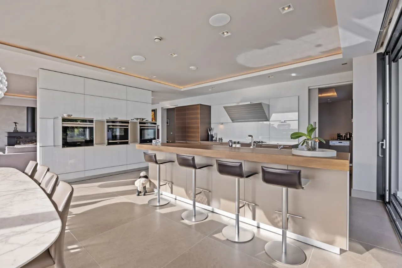 ‘Bulthaup’ kitchen with excellent range of high and low level units, large island unit with 1.5 bowl stainless steel sink unit and single drainer, chrome mixer taps and hot water tap, Siemens triple ovens with warming drawer, Siemens larder fridge, Siemens dishwasher.