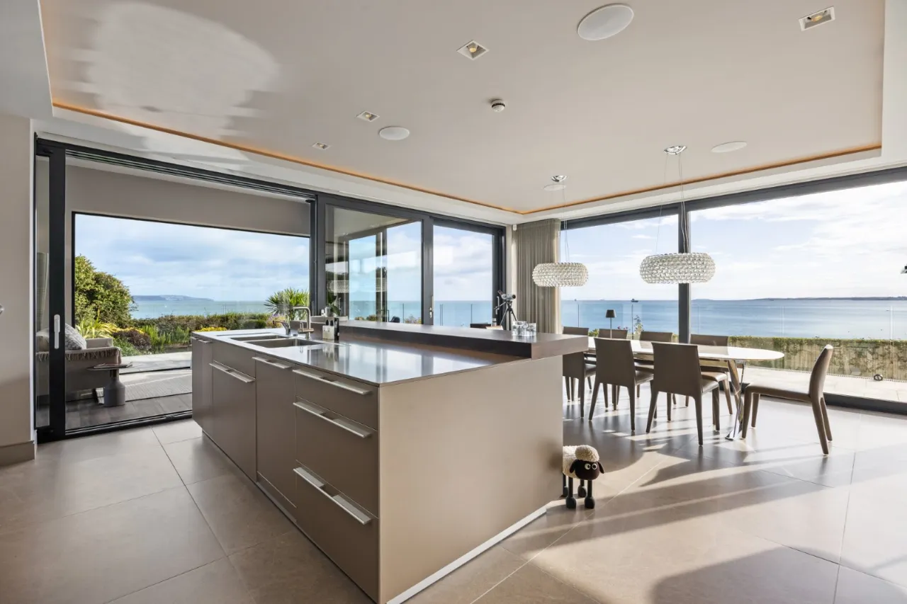 Siemens hotplate and electric/gas hob, feature ‘Bulthaup’ extractor fan, ceramic tiled floor and recessed lighting. Uninterrupted views along Helen’s Bay Beach, North Down Coastline to the Copeland Islands and County Antrim shoreline.