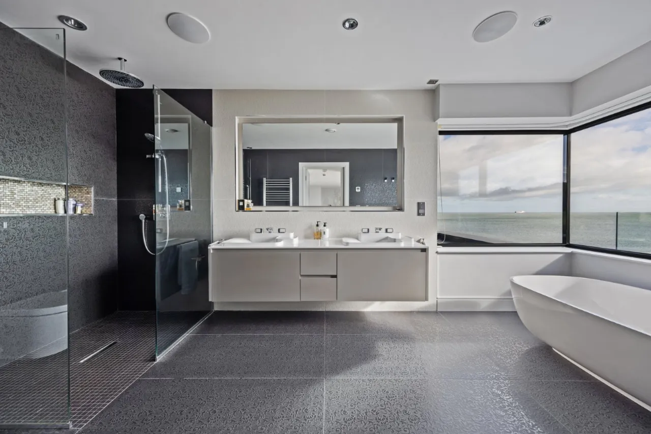 Contemporary white suite comprising: Large walk in shower cubicle, concealed cistern WC, twin sink units with mixer taps, Quartz worktops and shelving below, free standing bath with feature chrome mixer taps, fully tiled walls, ceramic tiled floor, stainless steel towel radiator, recessed lighting, corner window, spectacular uninterrupted views along Helen’s Bay Beach, North Down Coastline to the Copeland Islands and County Antrim shoreline.