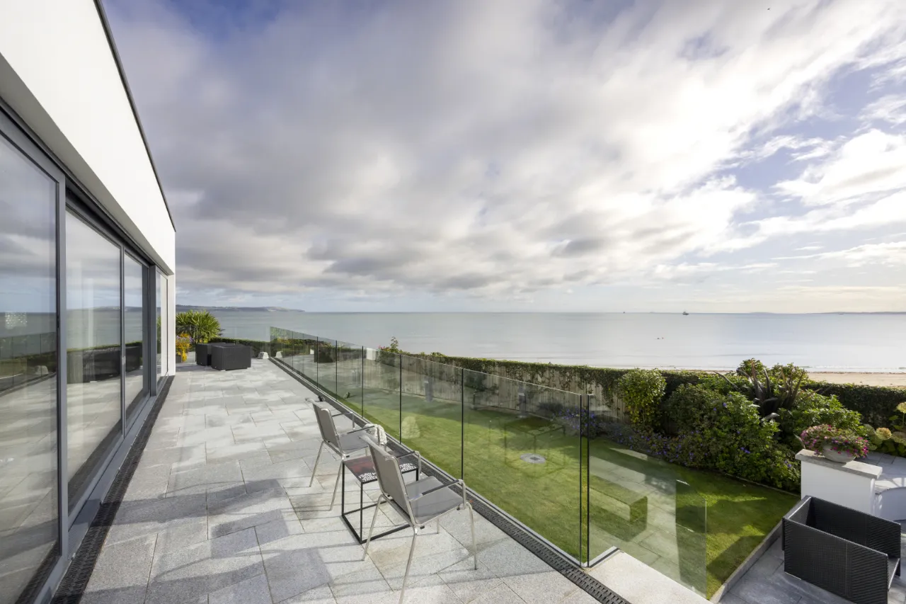 Tegular paved pathway surrounding property, excellent terrace with granite paving and glass balustrade panelling, accessed from main living areas.