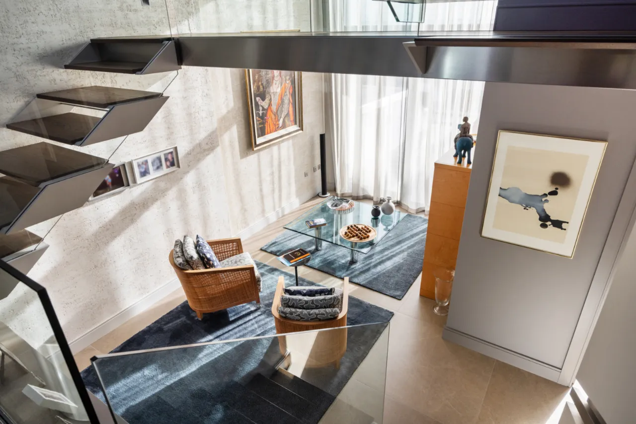 Glazed door and side panels from Entrance Porch, vaulted ceiling, magnificent feature floating stairway with glazed balustrade panels, ceramic tiled floor, feature inset gas fire, services and storage cupboards, elevator serving all floors, double opening doors to: