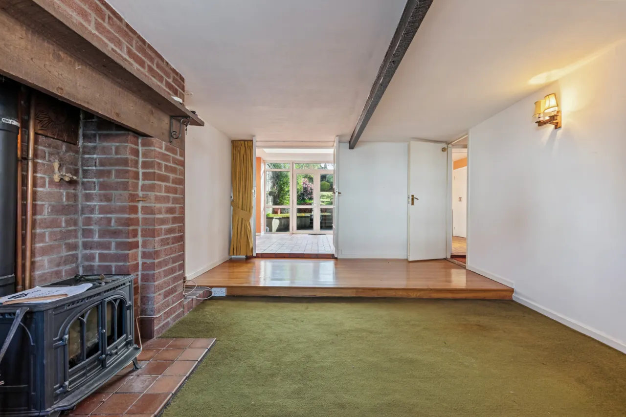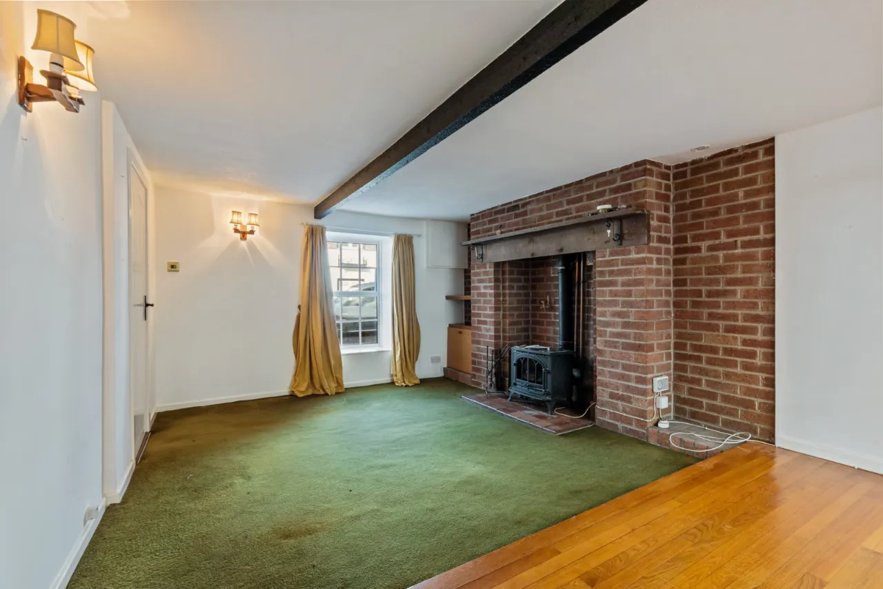 Living and dining room with open fire