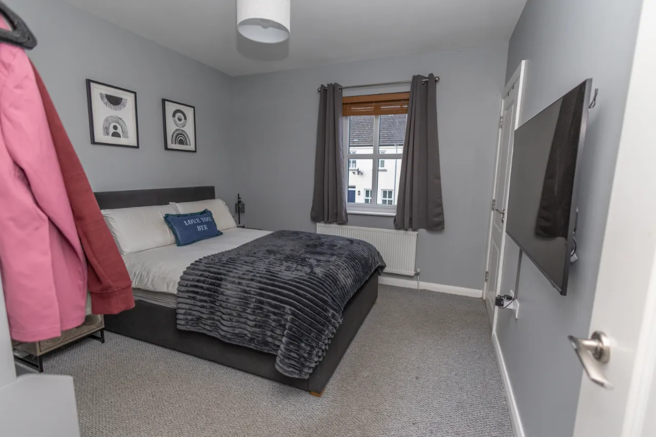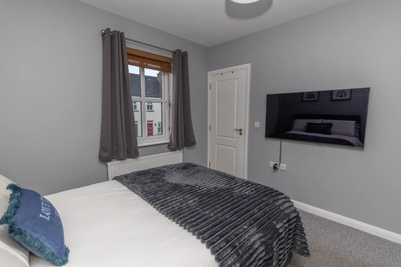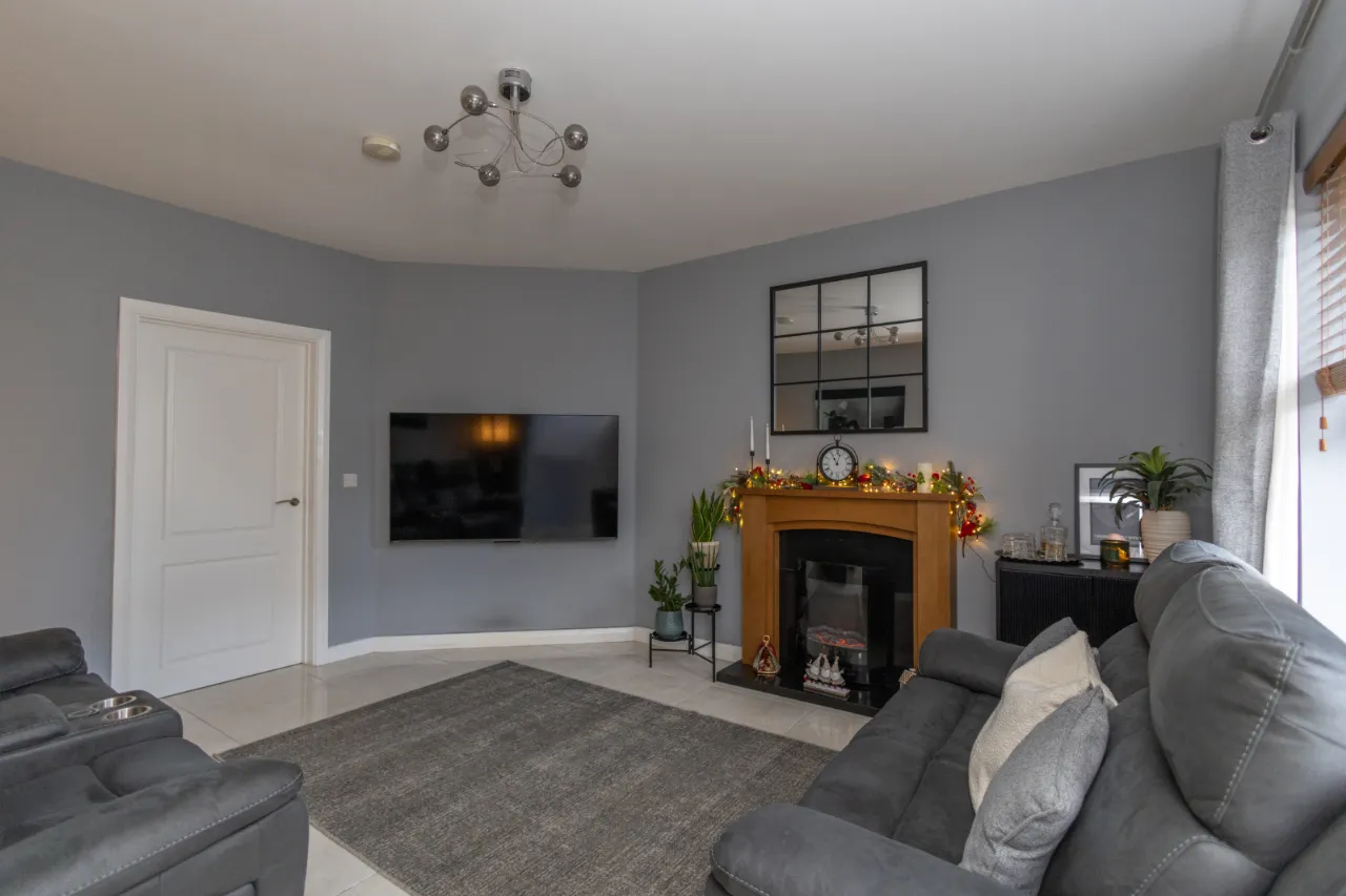 Living Room with tiled flooring, electric insert fire featuring a wooden surround and polished granite hearth and insert. The chimney flue is located in the corner of the room, offering potential for an open fire if desired. Double radiator and TV point.