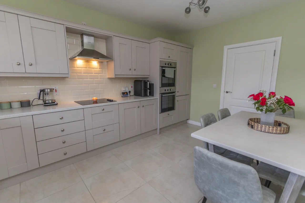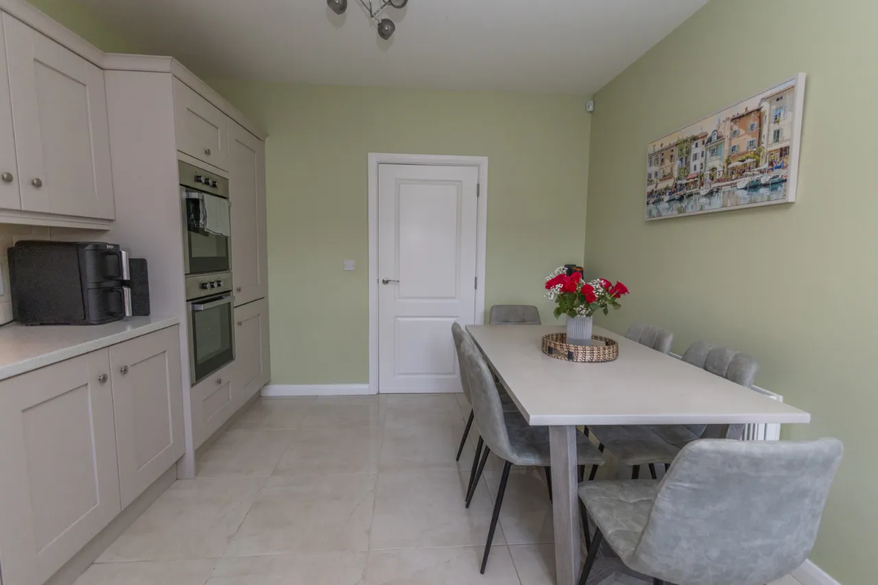 Kitchen / Dining Room with tiled flooring and upper and lower units with tiled splashback. Features a one-and-a-half bowl stainless steel sink and drainer. Integrated appliances include a fridge freezer, dishwasher, two ovens, and an electric hob with extractor hood above. Double radiator.