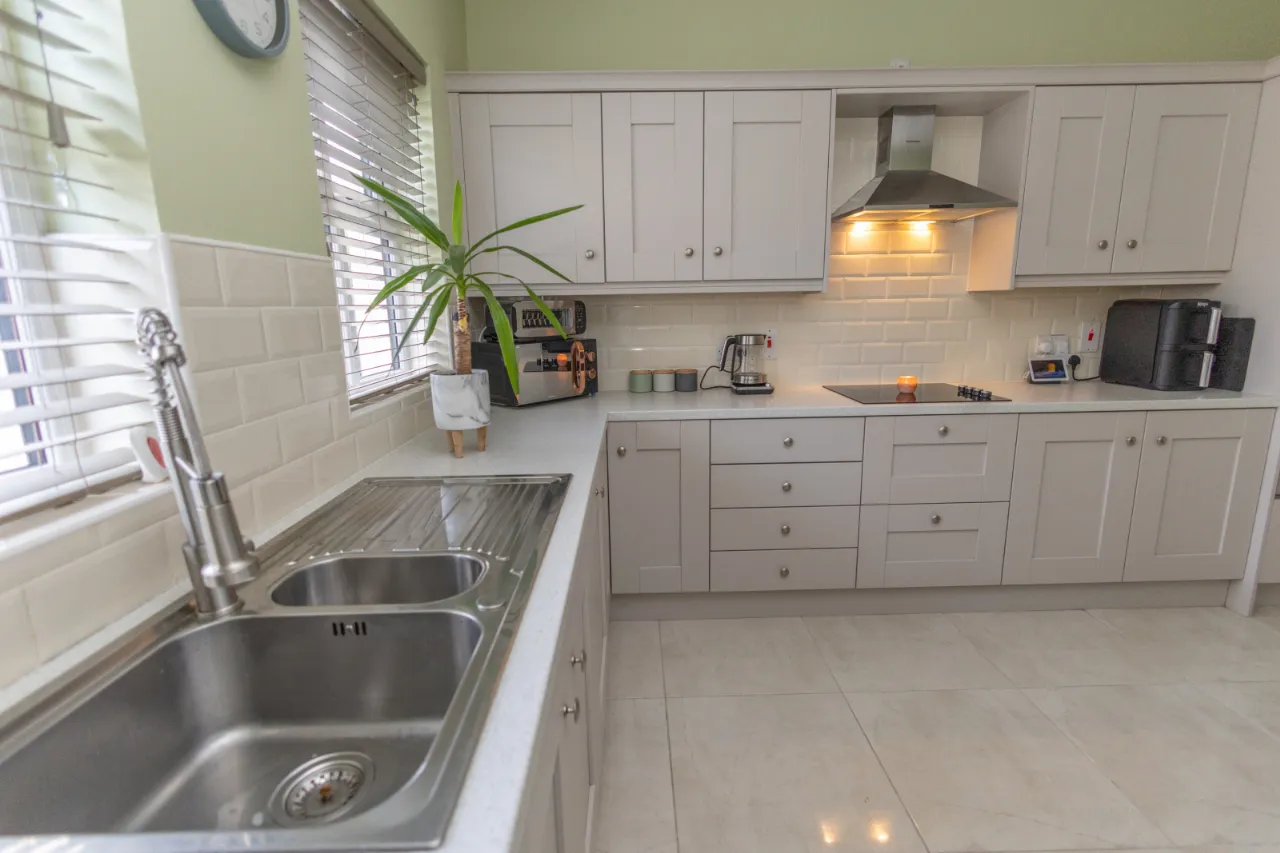 Utility Room with tiled flooring, upper and lower units with tiled splashback, and a one-bowl stainless steel sink and drainer. Plumbed for washing machine and tumble dryer. Single radiator.